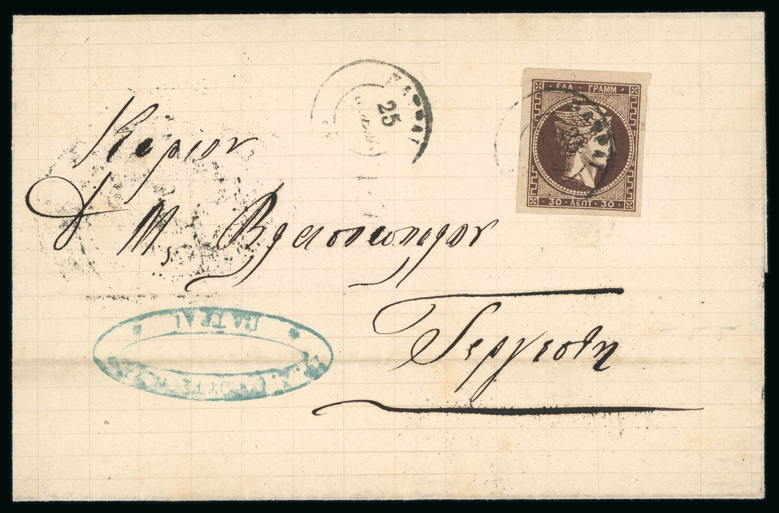 printings (1876-1877), good to very large margins; paid letter from Volos (Sept. 24th/Oct. 6th, 1883) to Saint Genis de Saintonge (Oct. 3rd/15th, 1883), via Piraeus & Brindisi with 5 lepta is from the cream papers printings w/o CN's (1880-1886) and