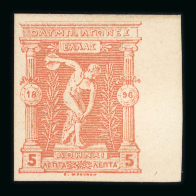 1896 Olympics 5l proof in rose-red on carton paper in tio left corner marginal block of four, very fine. (Image 1)