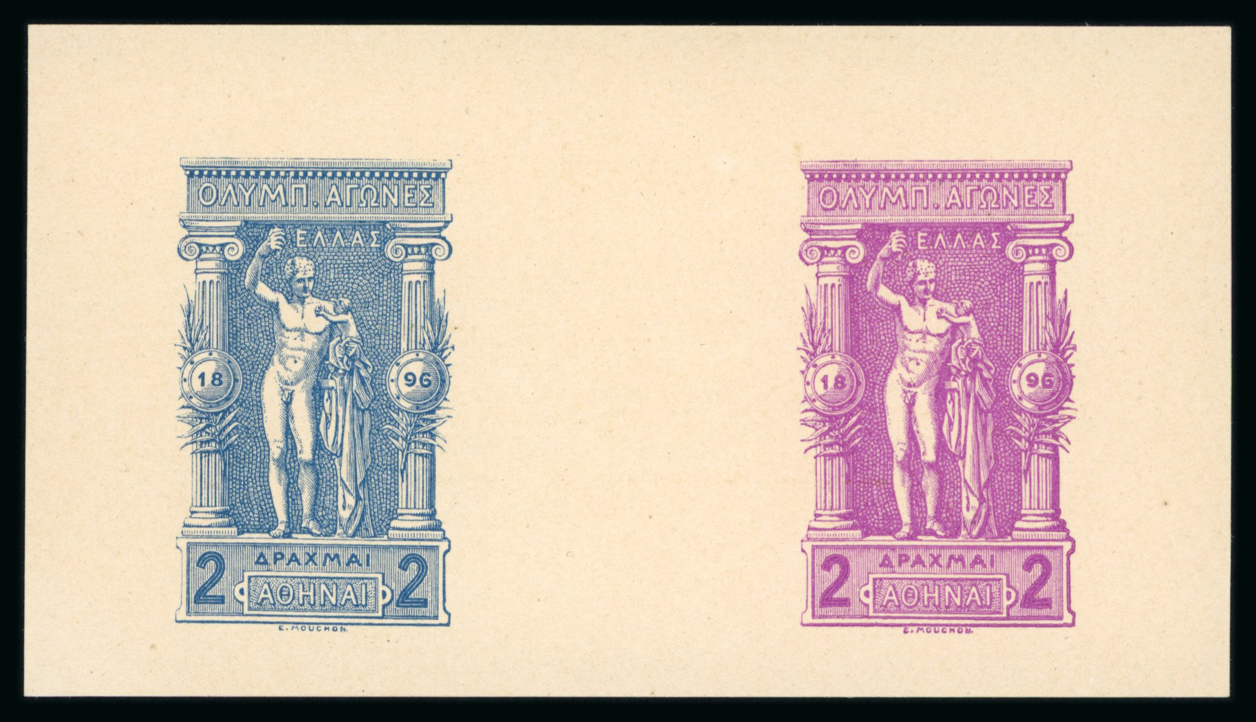 2 Drachma imperf proof reprints in blue and bright purple together on thick paper, signed E.Diena. (Image 1)