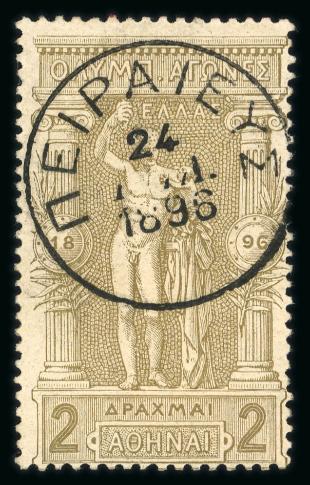 1896 (Mar 25) FIRST DAY OF USE (ATHENS 7): 1896 5d cto with largely complete Athens 7 cds, slightly rounded bottom left corner, Athens 7 was used for parcel post. (Image 1)