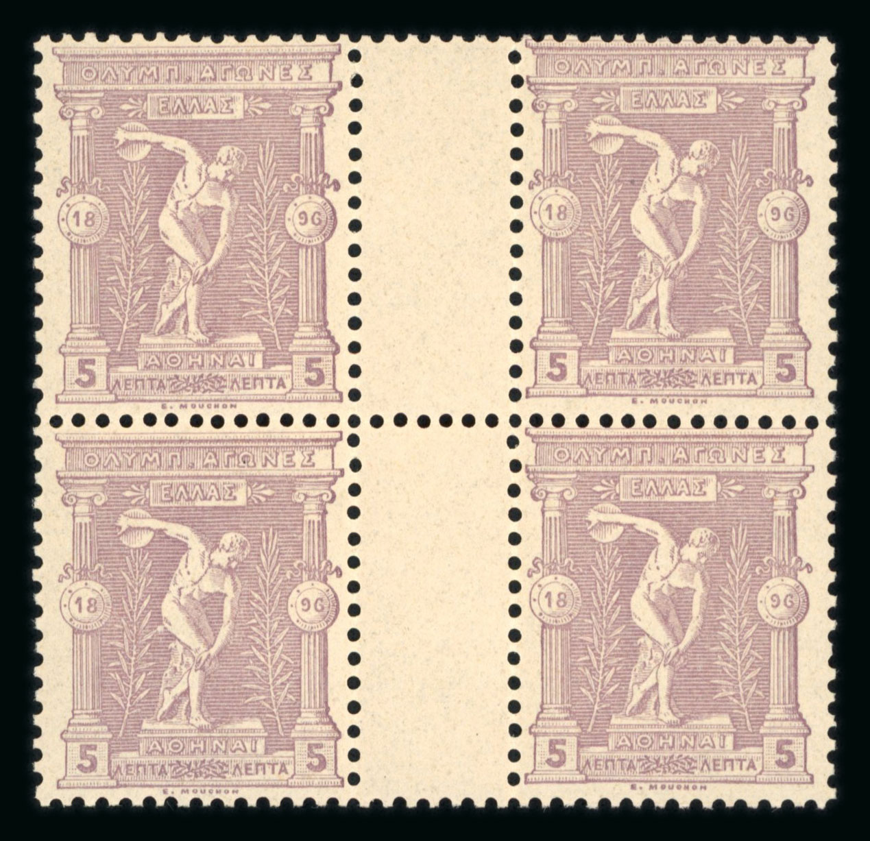 5 Lepta mauve, in mint and mint nh complete pane of 25 with intact margins on two side, one part of the gutter detached bottom left and an gutter strip at base fully detached, a couple of perforation hinge reinforcements, a fine and