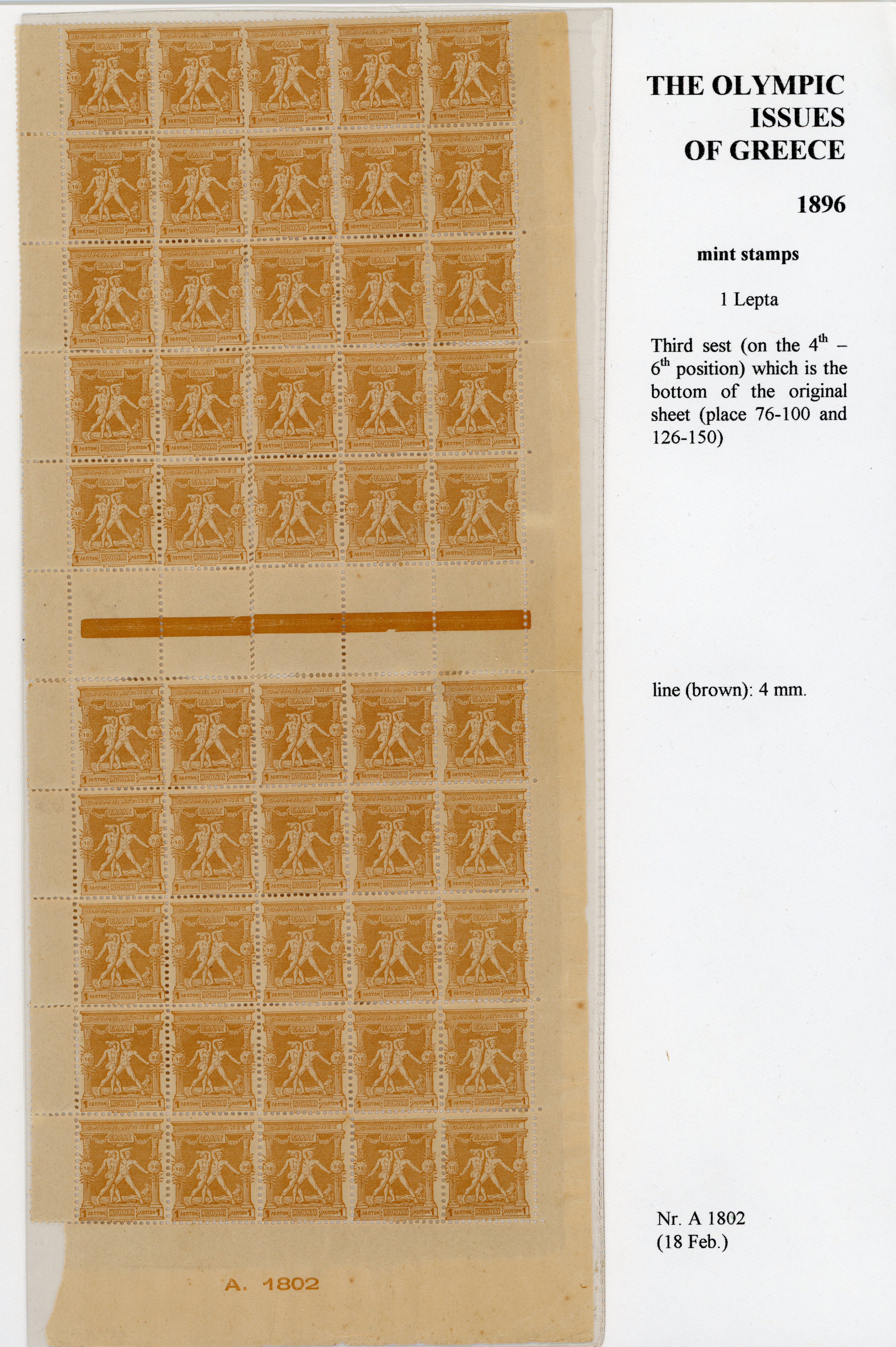1 Lepta bistre, in mint and mint nh gutter block of 50 from top of sheet comprising two panes of 25, with margins on three sides but no interpaneau at base, each pane has one violet circular Tameion handstamp on reverse, stamps split down