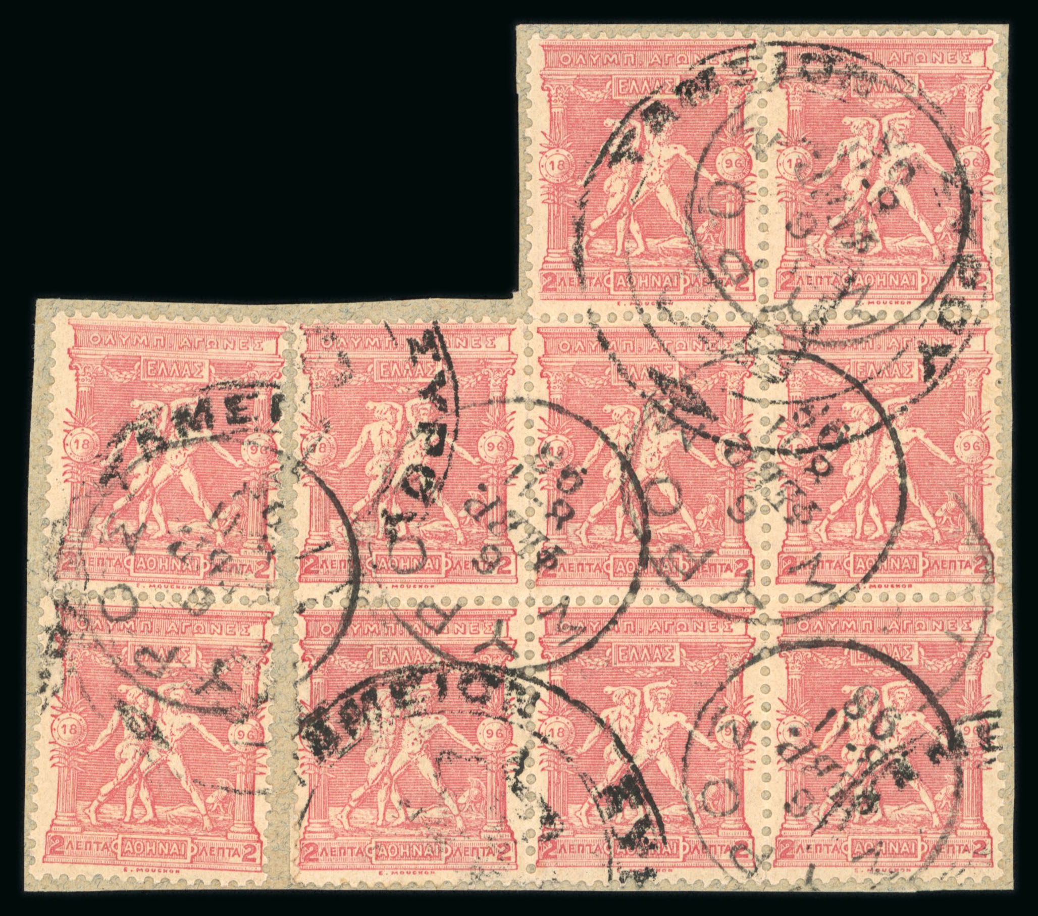 Lepta block of 12 Ithaca cds and 10 Drachma on piece of card with Athens 1 cds, 10th day small piece with 2 Lepta (2) and 5 Lepta, also with a 1 Drachma used with Athens 7 cds of 12th April which was the last day of the second IOC Session; a fine