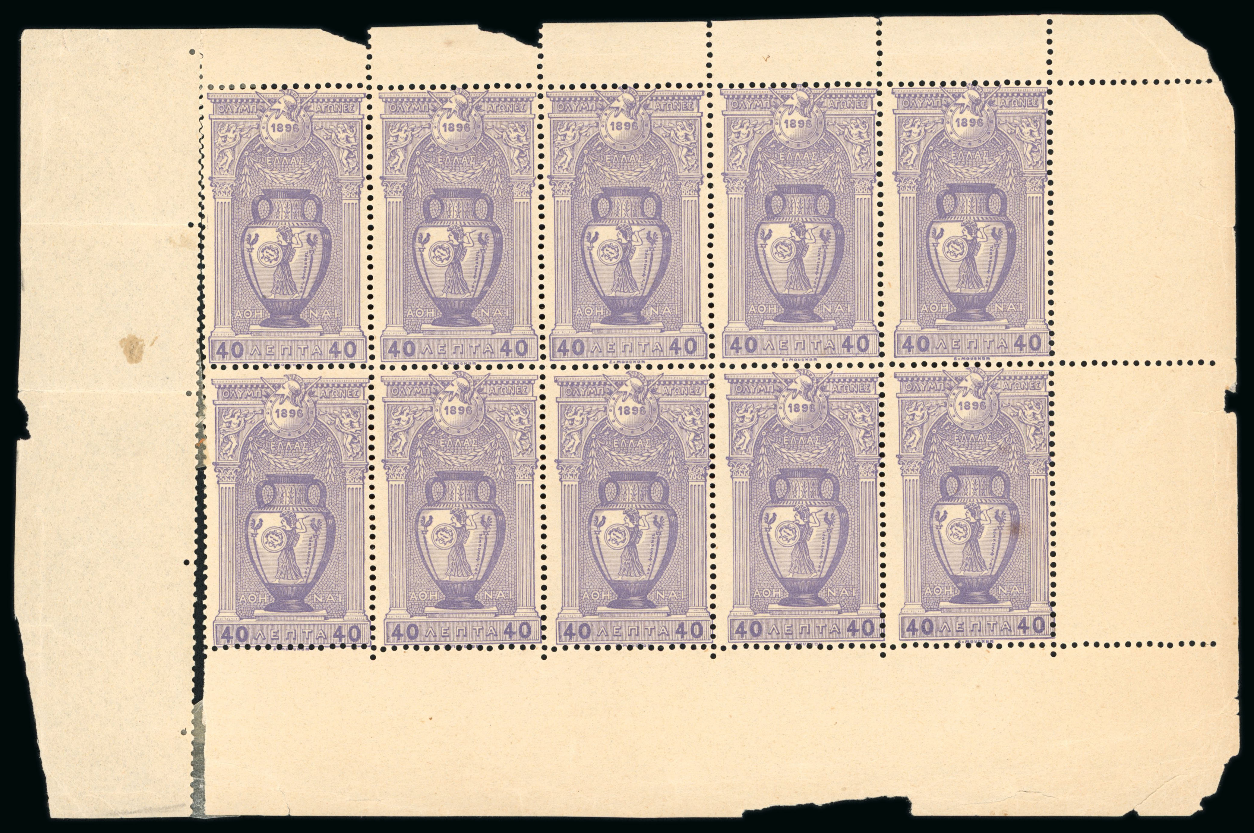 40 Lepta violet, mint never hinged with usual brown gum, in a complete pane of 10 with some slight creasing and paper loss around margins, a scarce complete pane (Image 1)