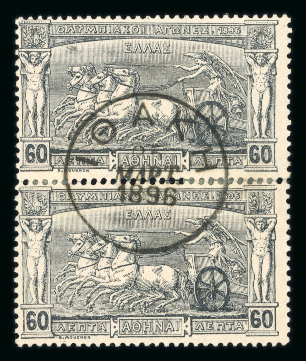 1896 (Mar 25) FIRST DAY OF USE (ITHACA): 1896 60 Lepta black, rejoined vertical pair cancelled by one full central cds, a scarce first day usage from here. (Image 1)