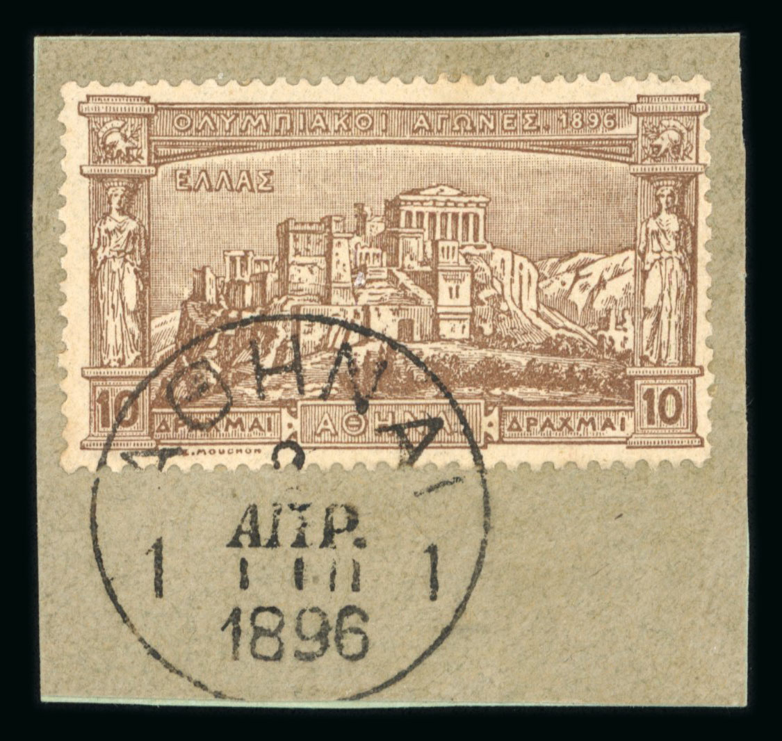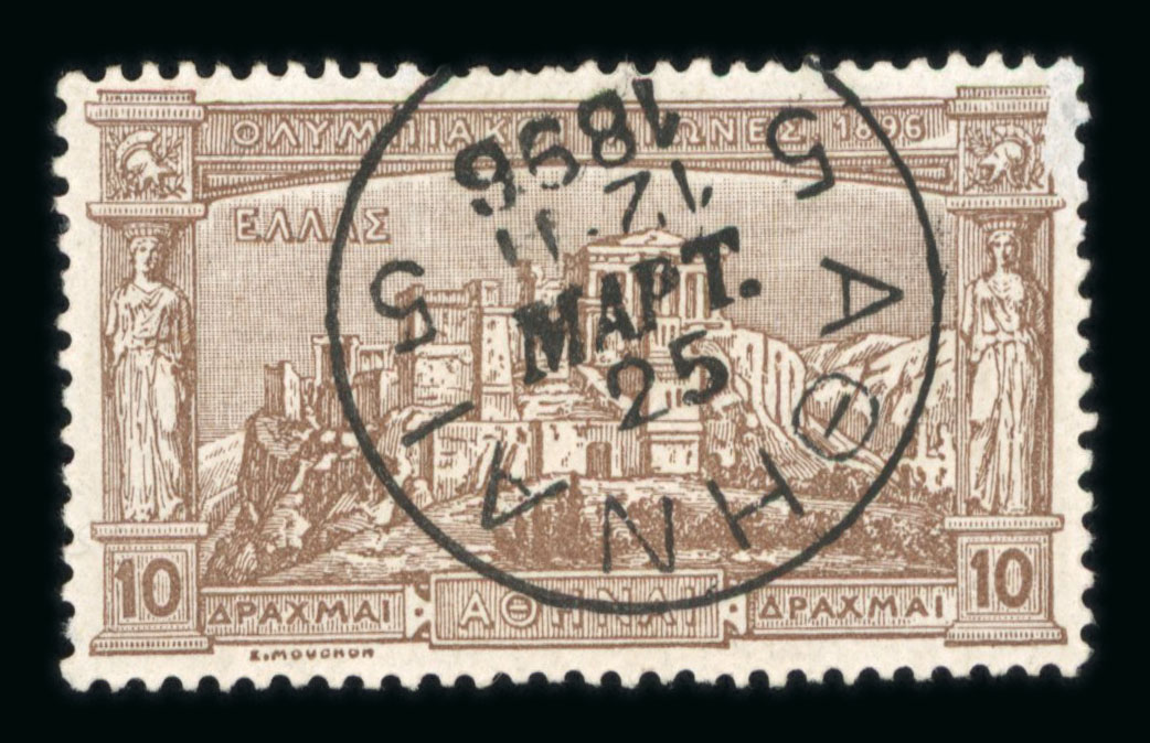 1896 (Mar 25 to Apr 3) cancellations from each day of Games with 10 Drachma fine used first day at Piraeus, 25 Lepta second day, uprated stationery letter card to Belgium used third day, 4th to 7th days with lower values, 9th day with 2