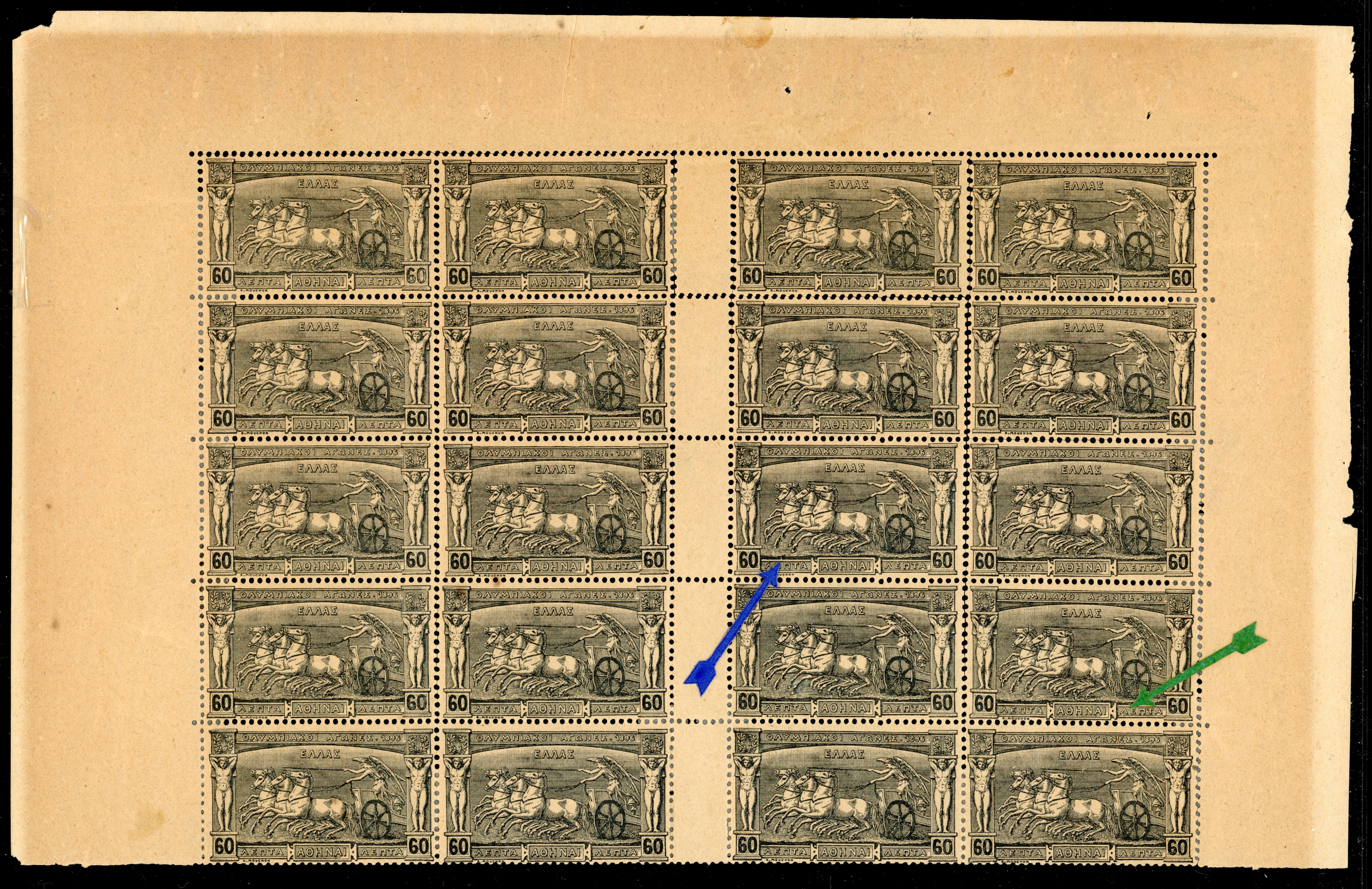 60 Lepta black in two panes of 10 from the top of the sheet with margins on three sides and panes separated by a gutter, positions 11 and 16 show small plate flaws. A fragile block that has hinge reinforcement at edges and on gutter, one