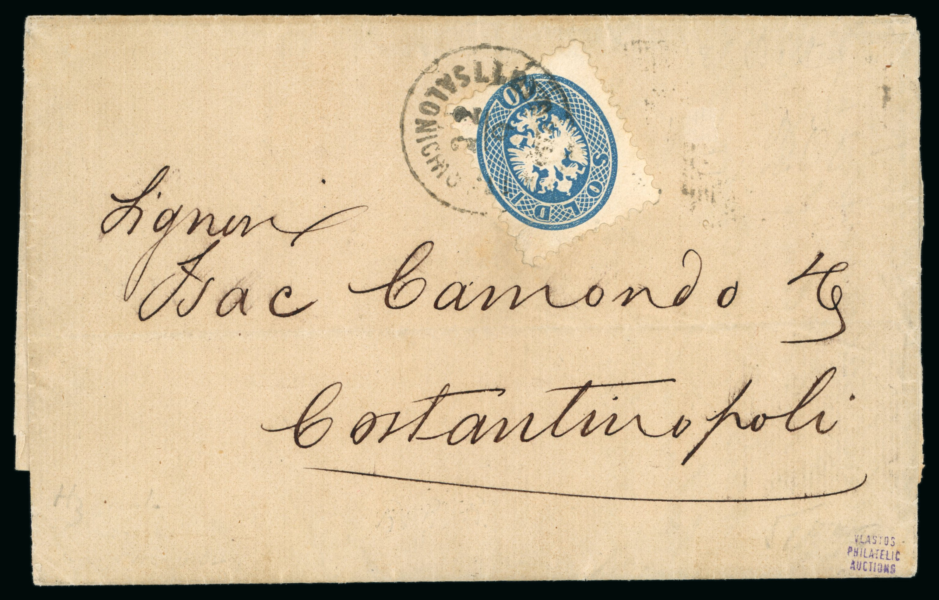 SALONICHIO: 1867 Folded entire to Constantinople, franked 1867 10s blue tied by LLOYD AGENZIE / SALONICHIO / 22.9 cds, Austrian Lloyd arrival bs, fine and scarce; cert. Galinos (2000). (Image 1)