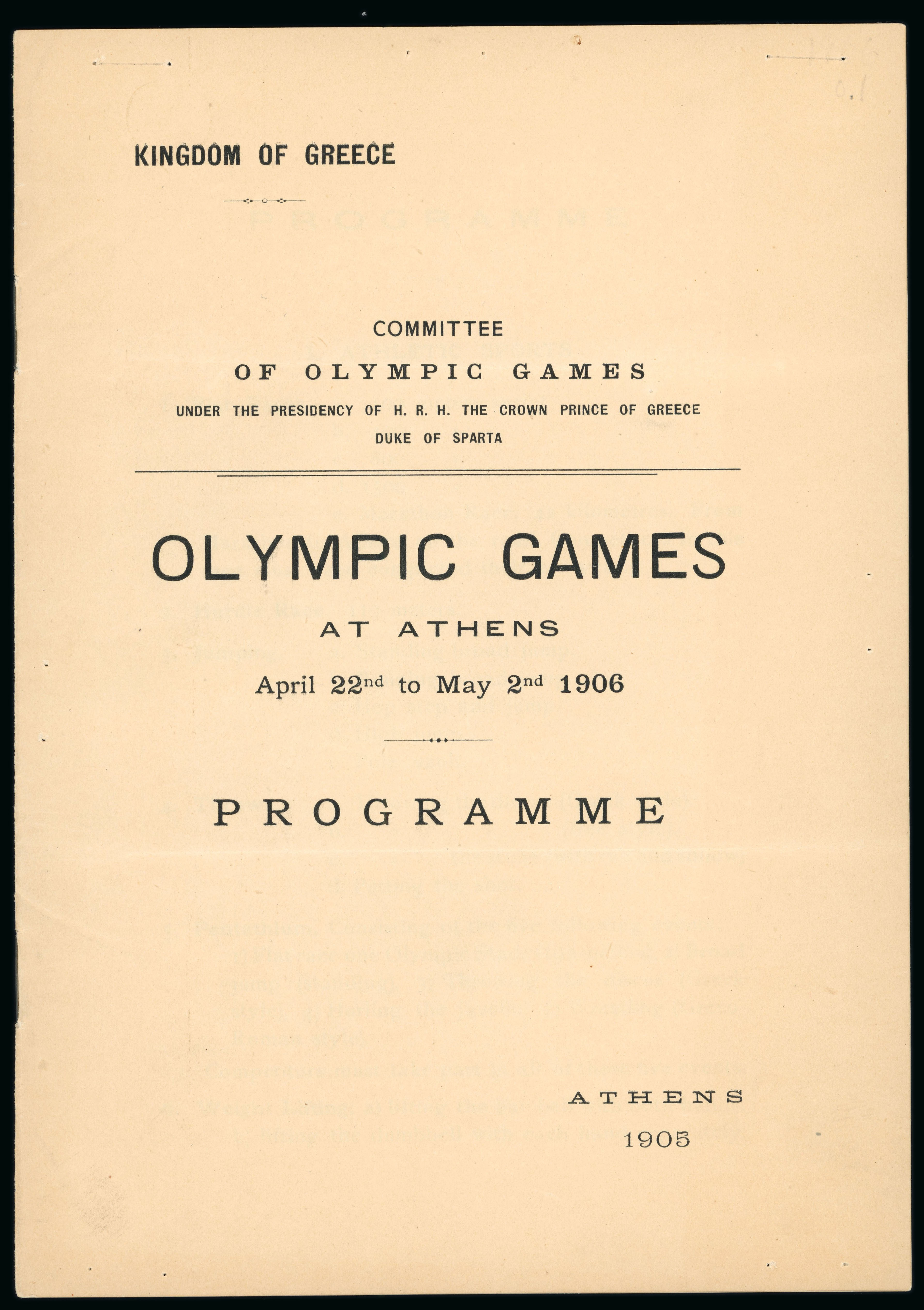 1906 Olympic Games at Athens Programme, an eight sided item that lists all the sports taking part but no details of when or where, some staple holes at top of each page and two horizontal folds, generally good fresh condition (Image 1)