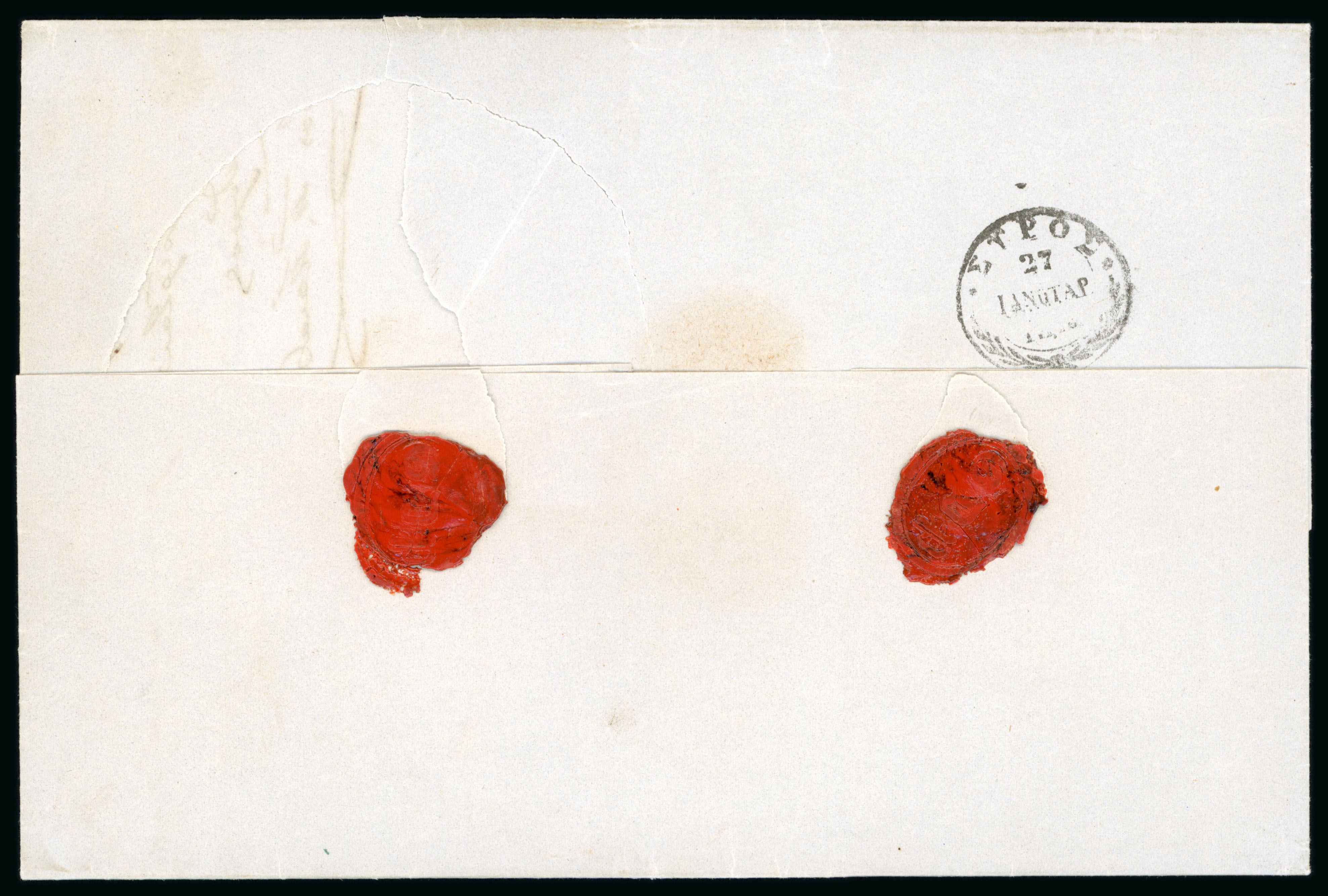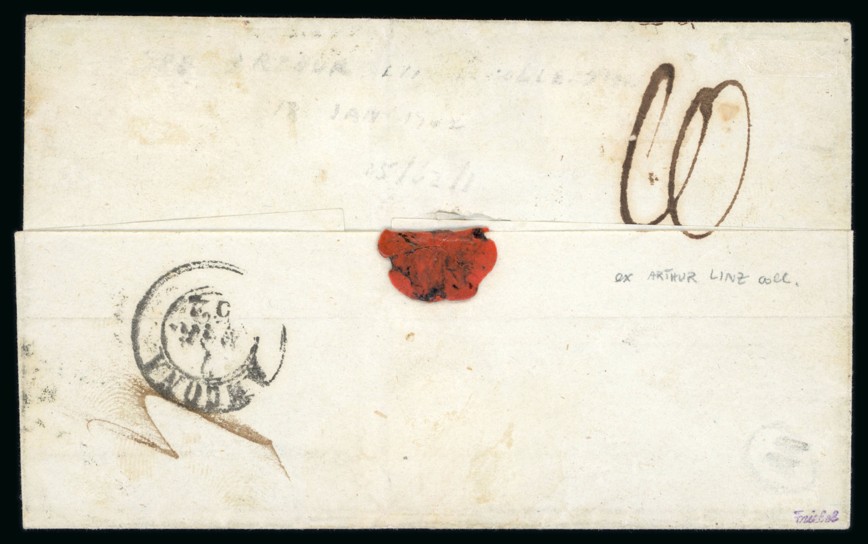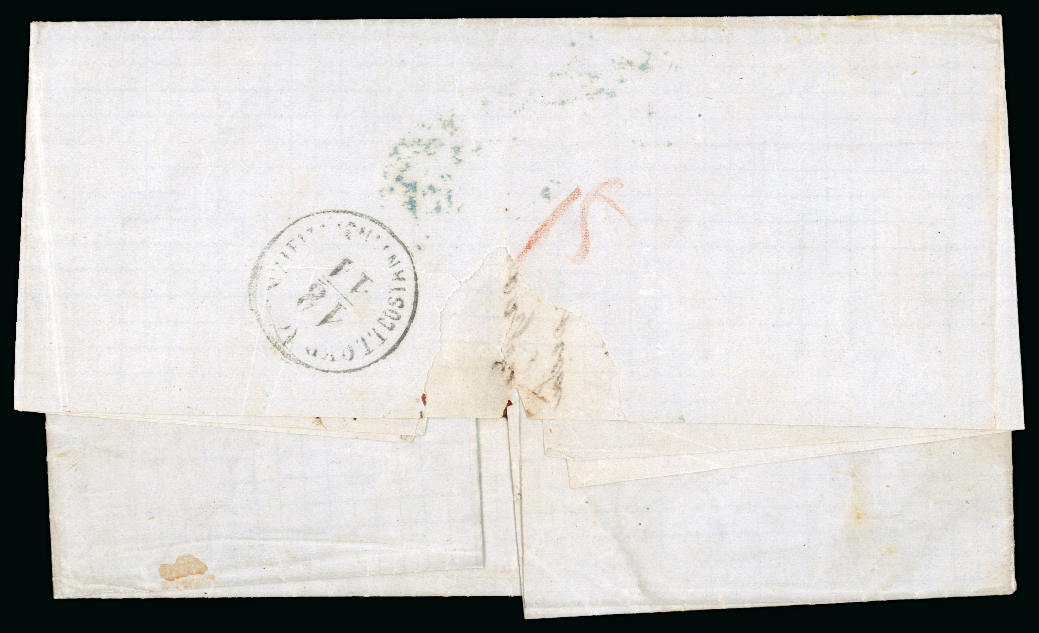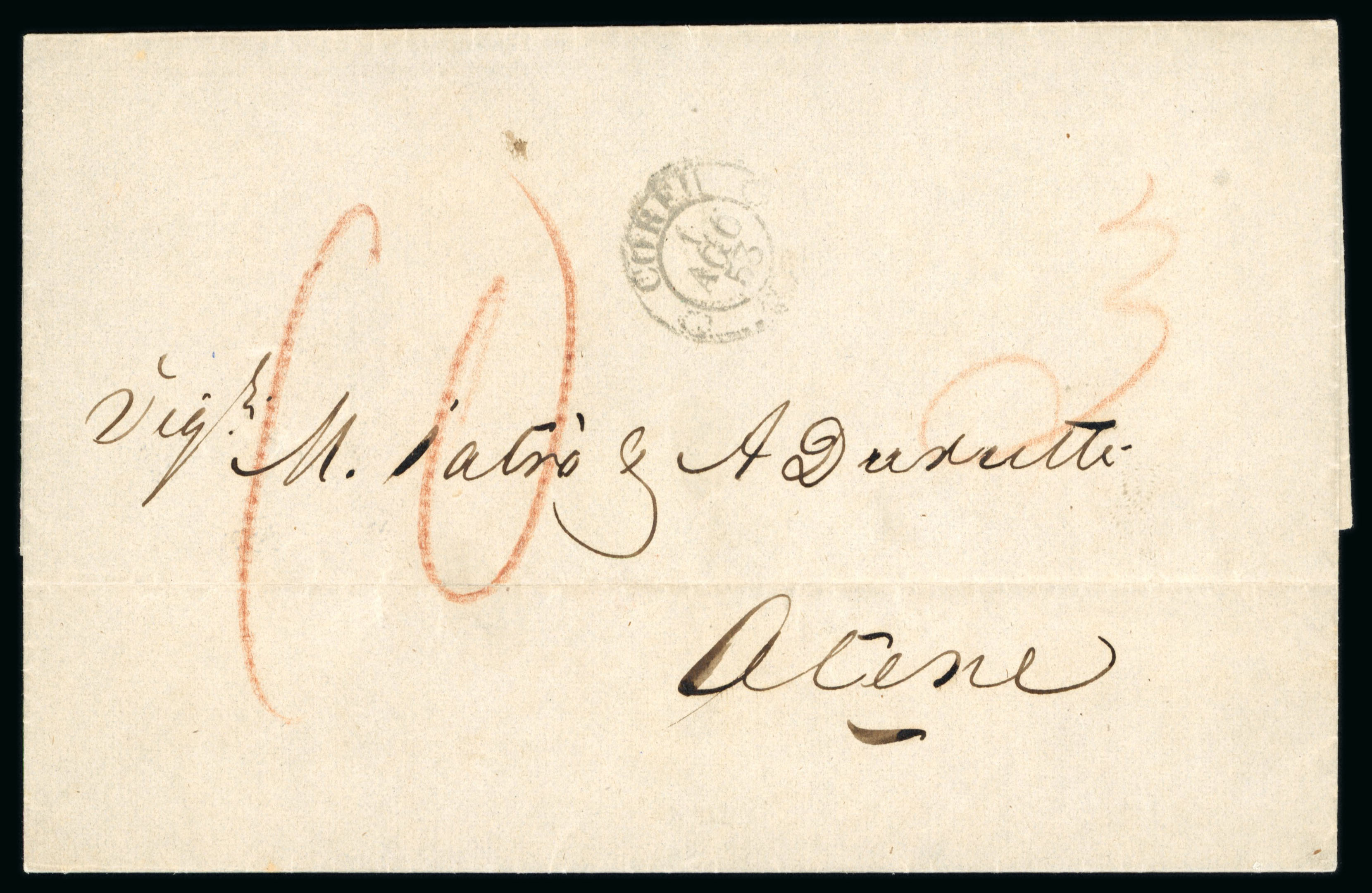 Lloyd Austriaco Ancona handstamp at right partly overstruck by arrival cds, brown '10' for 10soldi ship's charge and red "3" on front for Ionian incoming postal charge, Holcombe Cert (1992) and RPSL (2004), Ex Linze and Müller. (Image 1)