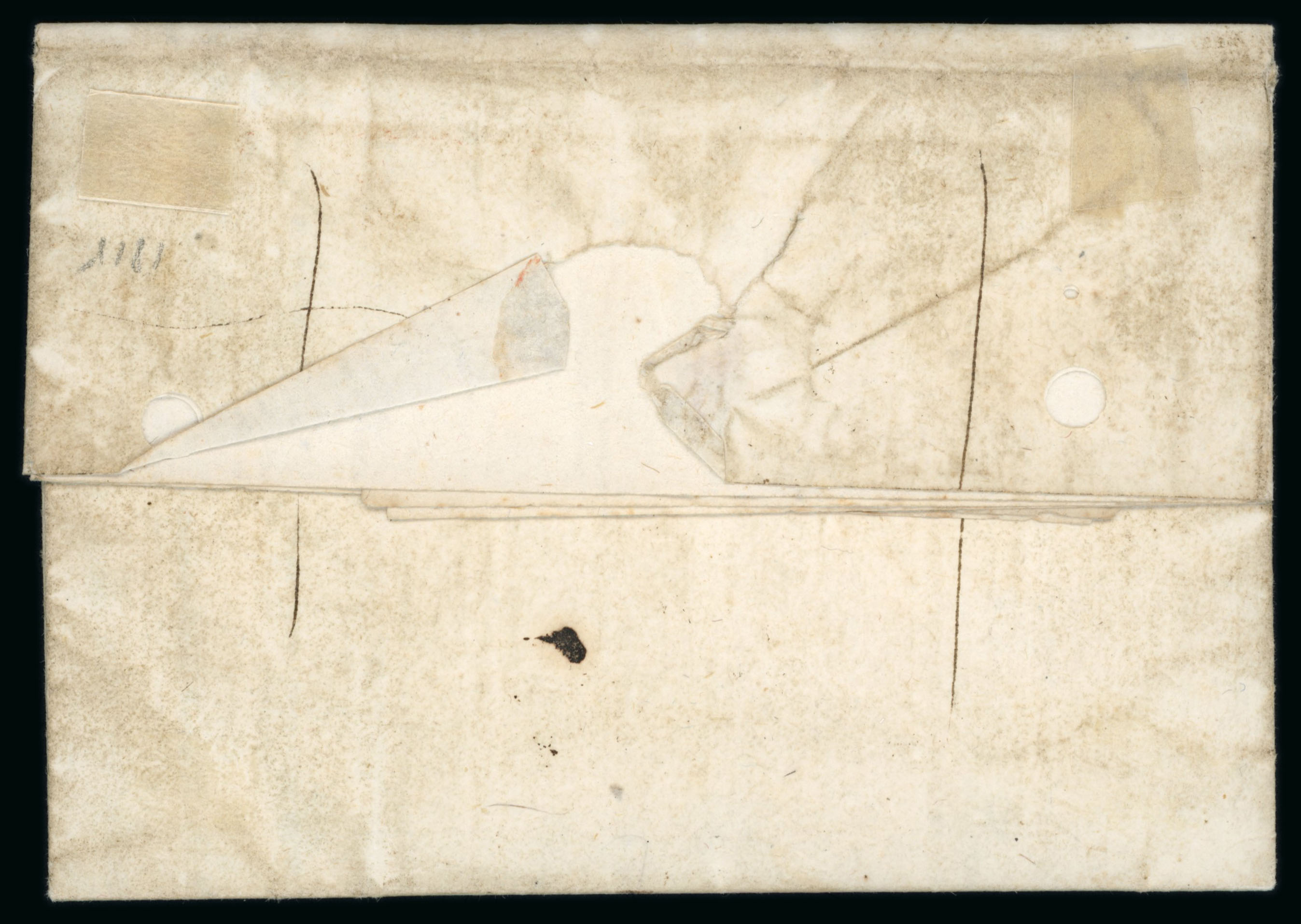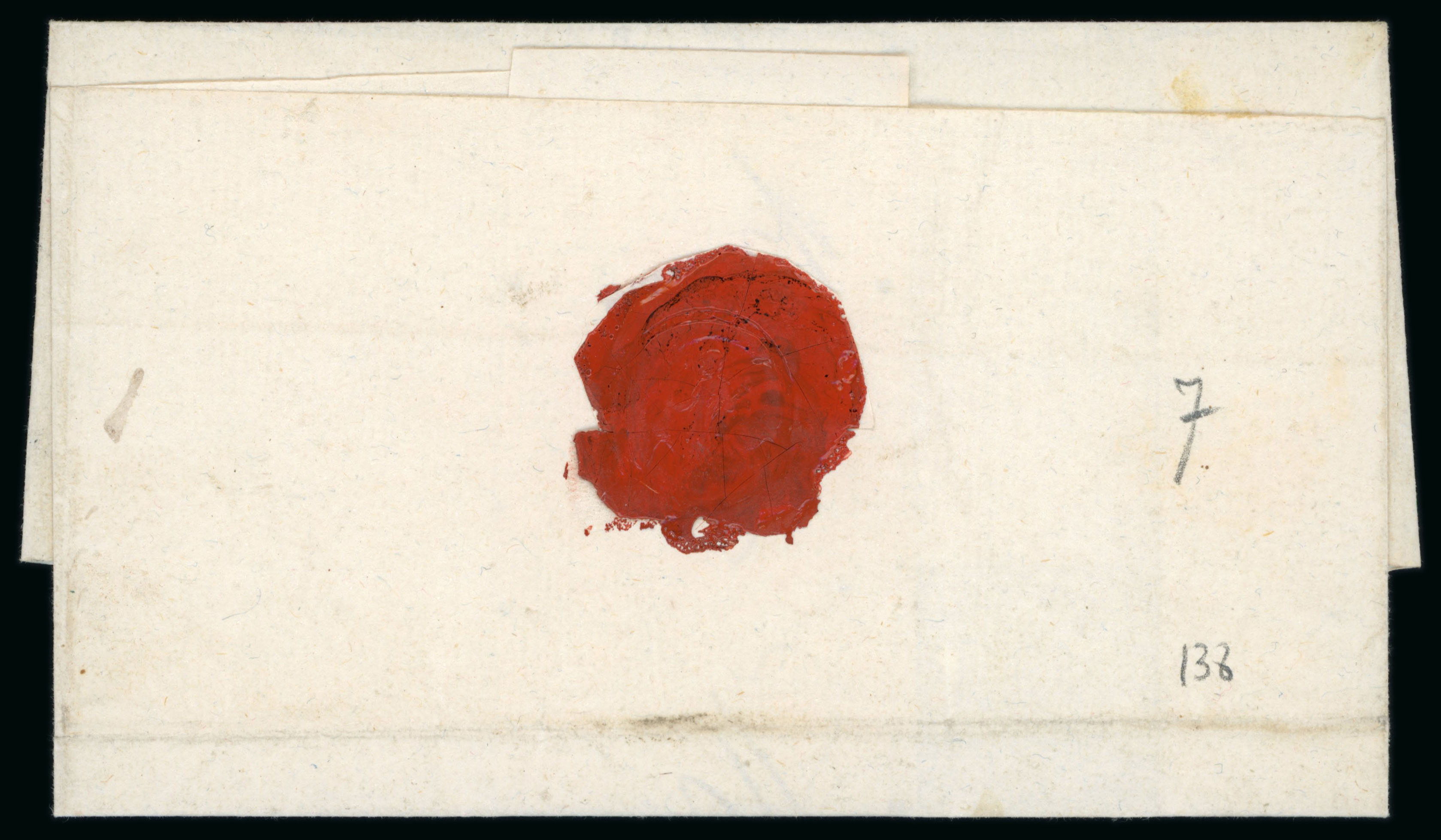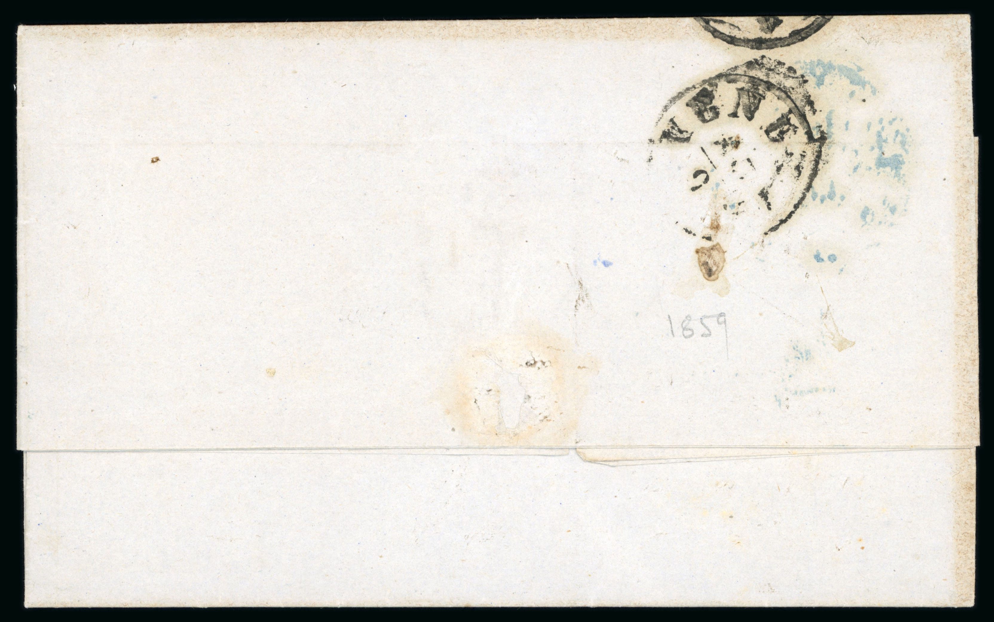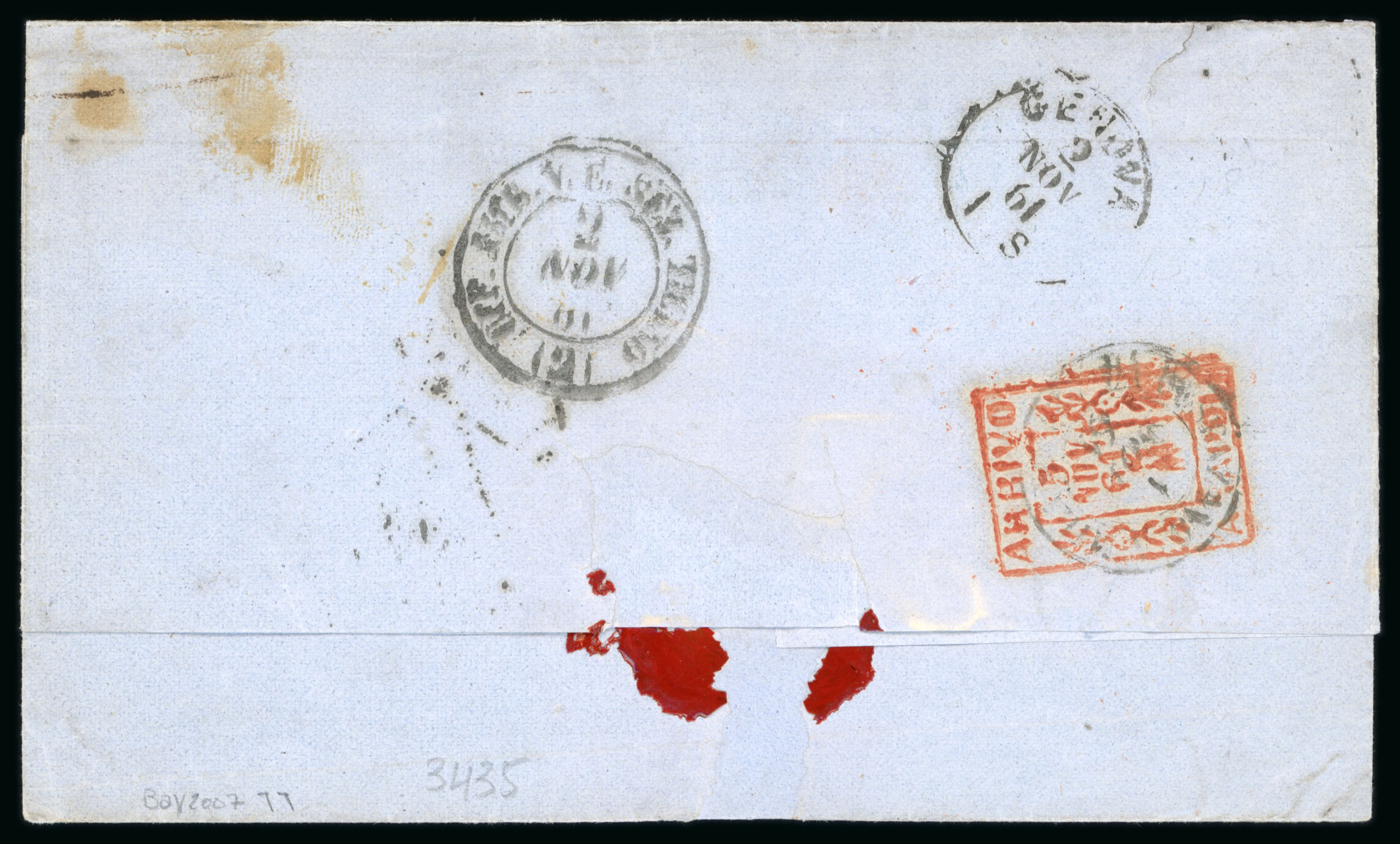 Lloyd Austriaco Ancona handstamp at right partly overstruck by arrival cds, brown '10' for 10soldi ship's charge and red "3" on front for Ionian incoming postal charge, Holcombe Cert (1992) and RPSL (2004), Ex Linze and Müller. (Image 1)