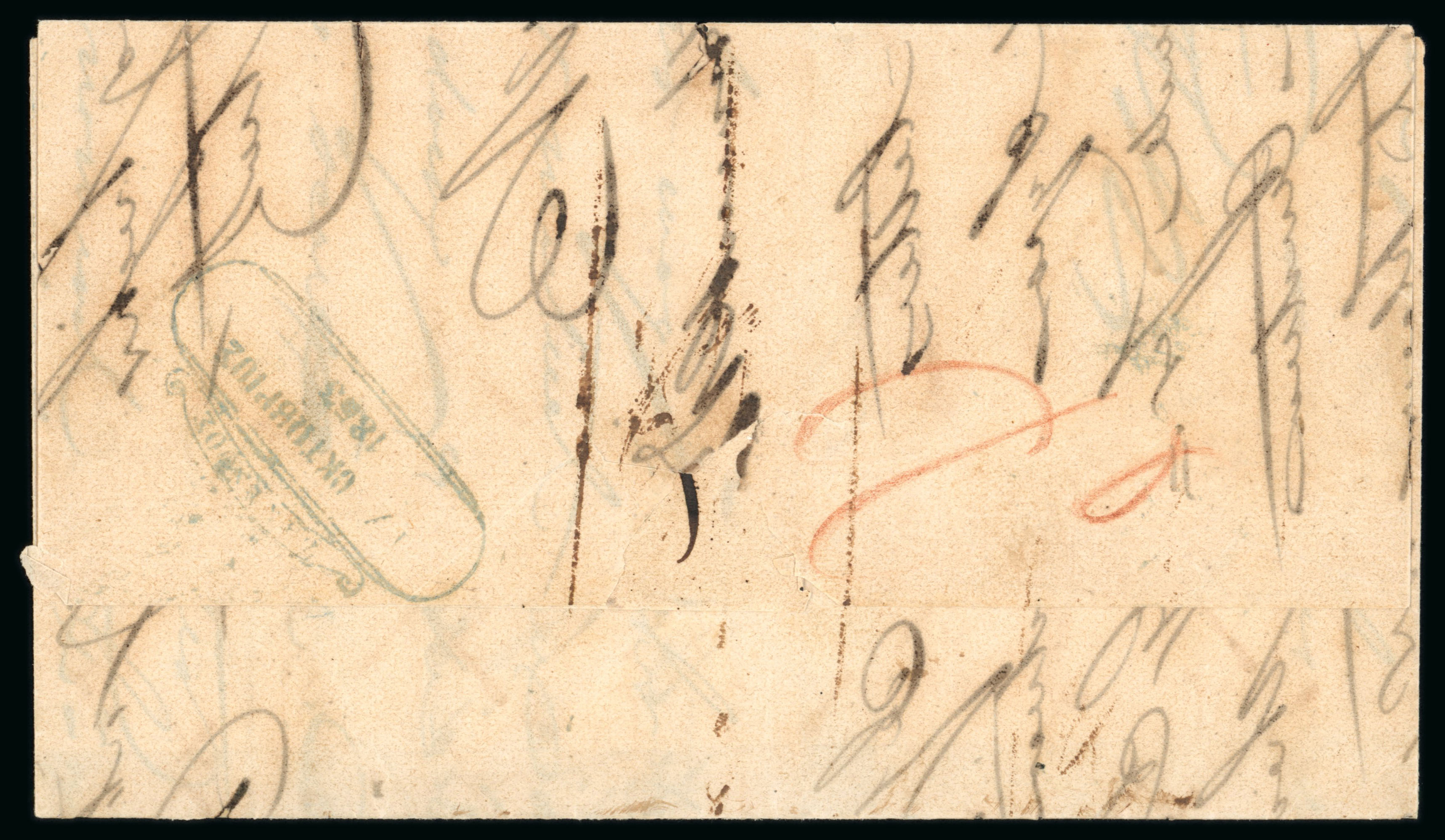 1856 entire to Syra, Greece with unclear scroll despatch cancel at base alongside company chop, fine oval accountancy markings of "7 1/2" at right for Ionian Island postage and "6" at left for packet to Syra, "60" lepta red crayon charge