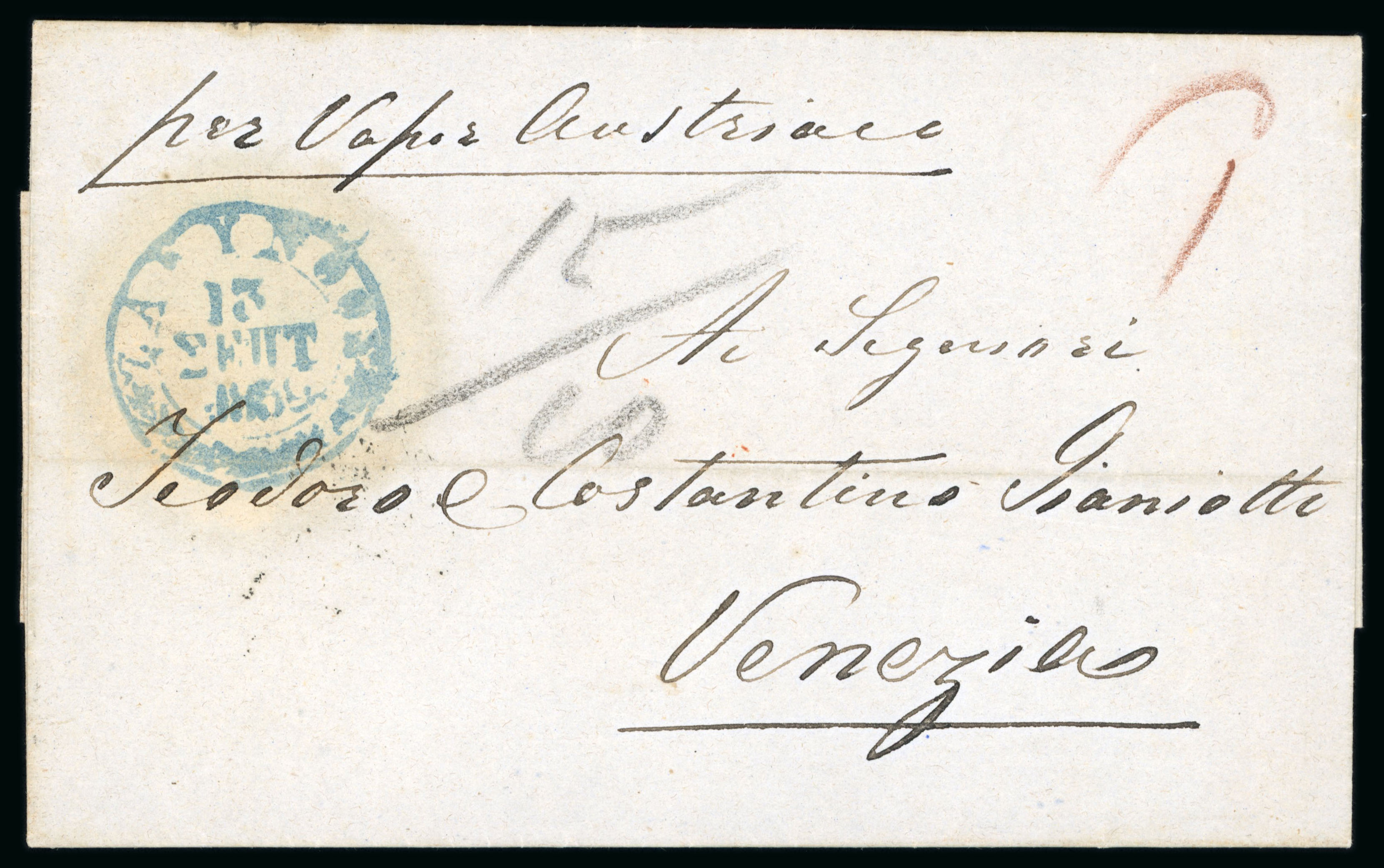 1859 entire to Venice, endorsed "por Vapor Austriaco" with blue Zacynthos double-ring despatch, red "1d" Ionian postal charge, pencil "15/10" accountancy for the 15k Austrian ship's charge to Trieste, and 10 kreuzer for carriage from