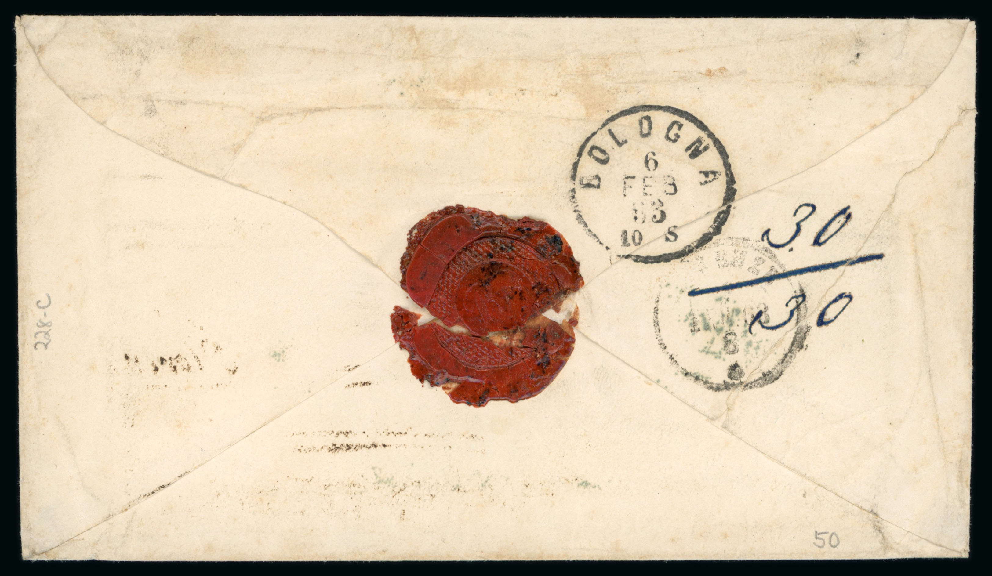 1863 (1 Feb) envelope to Firenze bearing central Lefkas double circle cds, endorsed "Via Ancona", reverse with Bologna transit and arrival cds, obverse with red manuscript "2" indicating Ionian postal duty, green oval-framed FRANCA and