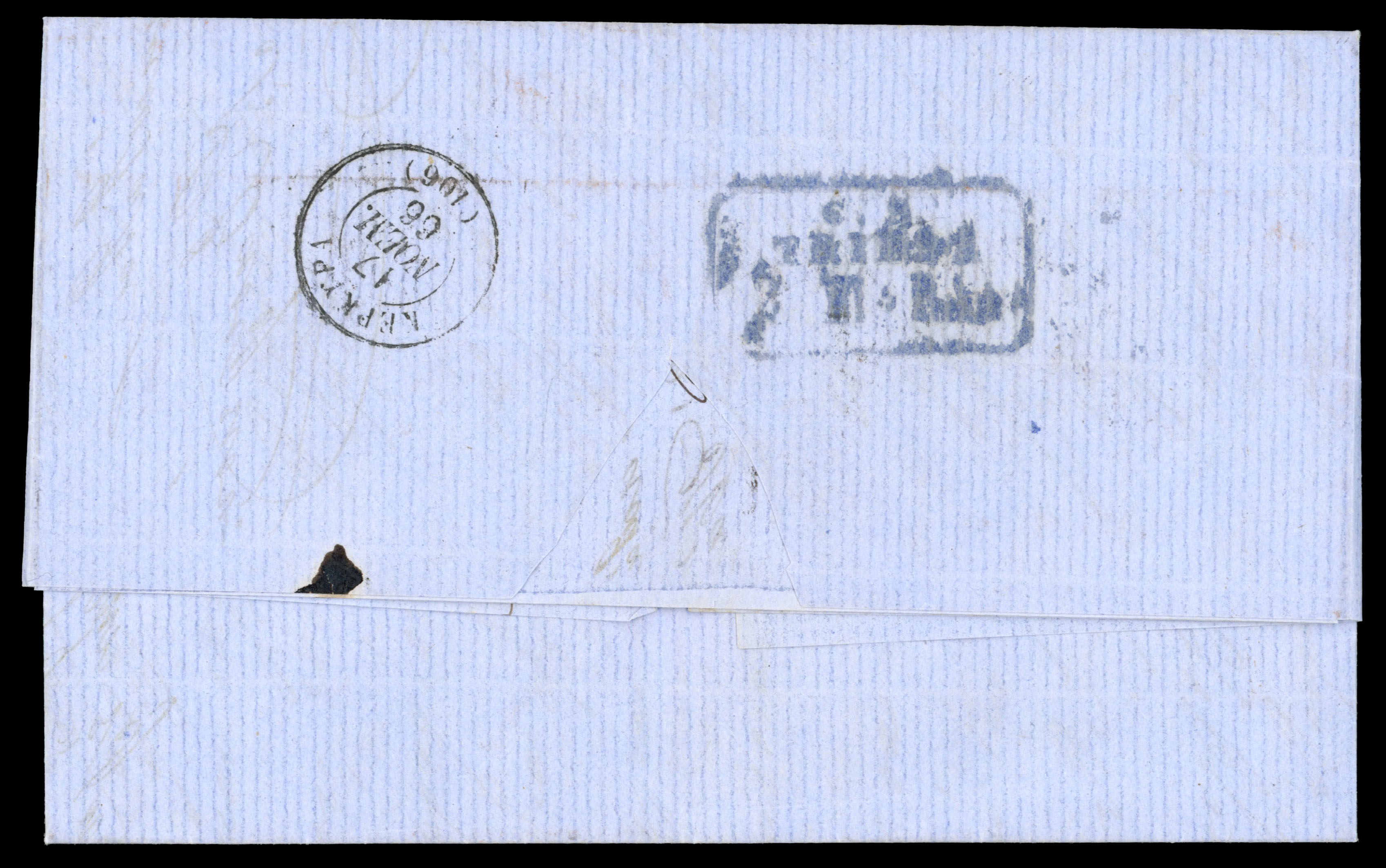 Lloyd Agenzia Constantinopel arrival backstamp, and 1866 entire to Trieste via Corfu, endorsed "Col vapore Austriaco". (Image 1)