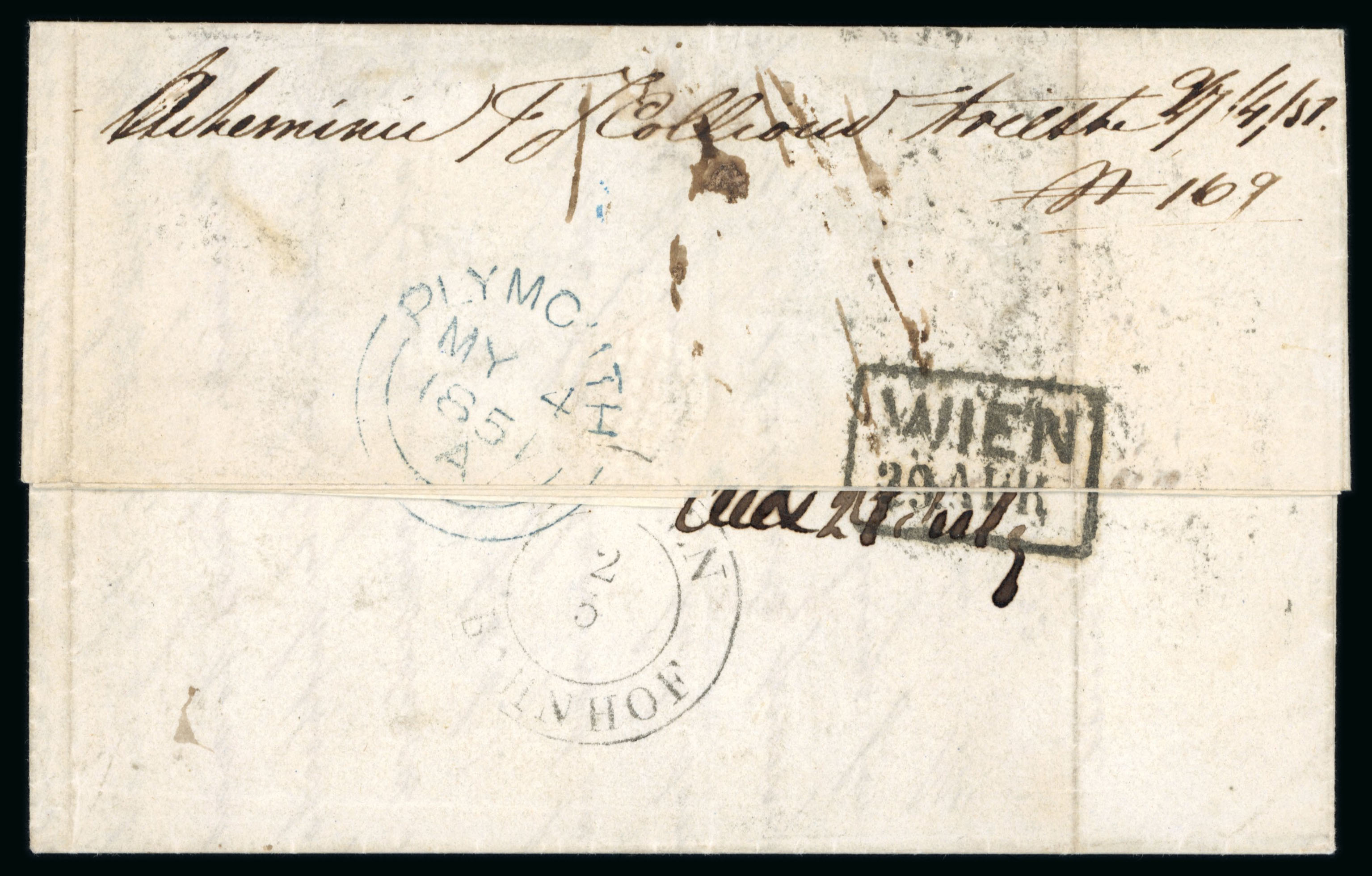 1851 (24 April) Mail to Great Britain: Entire discussing price of currants to Plymouth , endorsed "Via Trieste - Berlin & Ostend" showing a blue manuscript "3" for local carriage but no legible cancel, Trieste cds on front, reverse with
