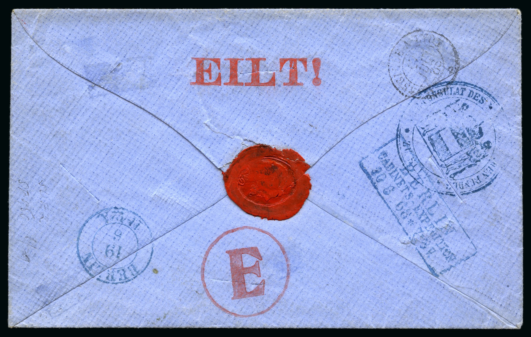 / 19.6 and a framed BERLIN / CABINETS - EXPEDITION / 20 6 68 (the day before the outbreak of war between Prussia and Austria), also on the reverse the seal CONSULAT DES NORD- DEUTSCHEN BUNDES ZU SUEZ, right stamp with fault covered by a partial fake