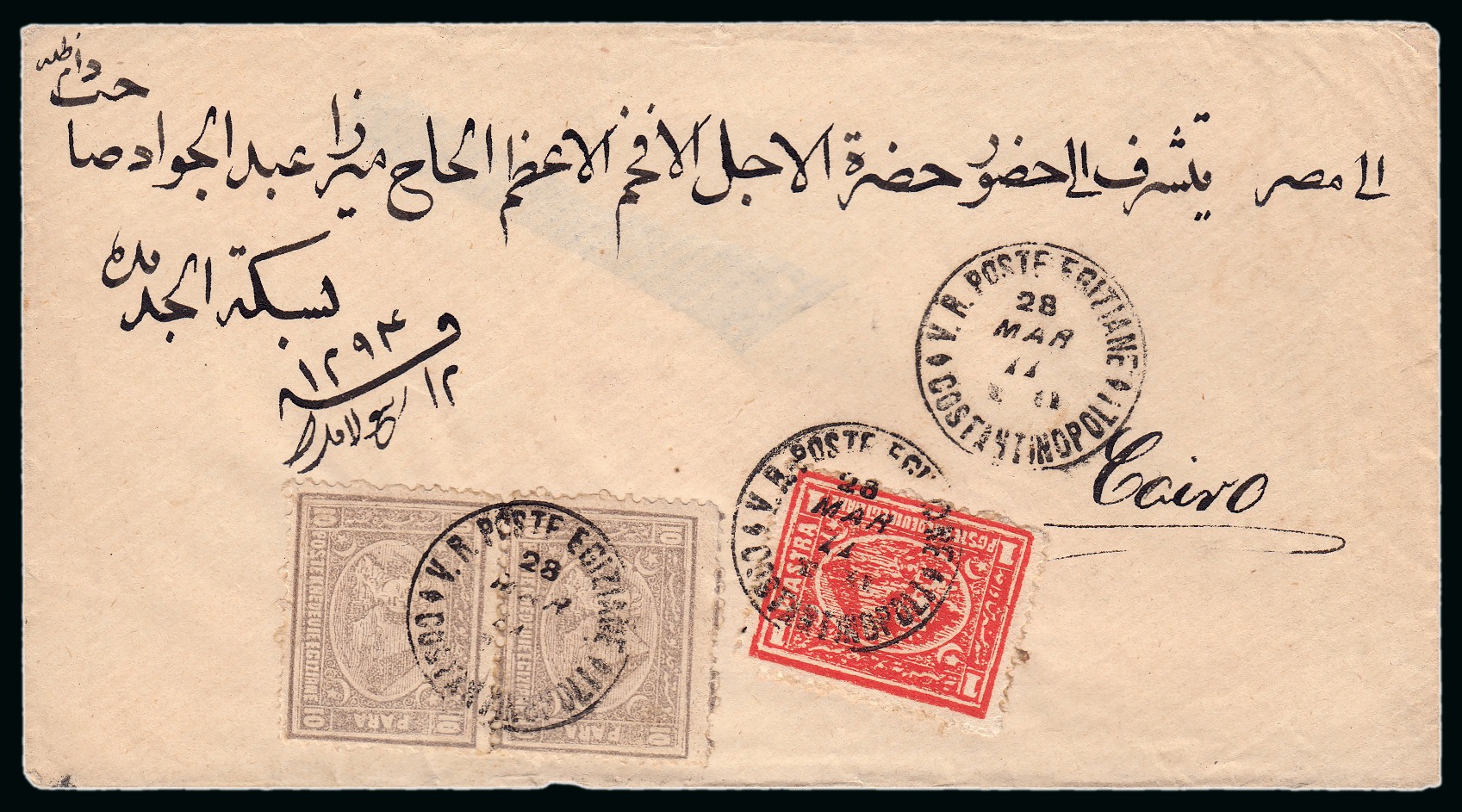 1875 (14.4) Incoming envelope from Constantinople to Cairo, franked with 3rd Issue 2 pi. yellow (2), tied by V.R. POSTE EGIZIANE / CONSTANTINOPOLI / 14 APR 76 circular datestamp with another strike alongside, arrival backstamp