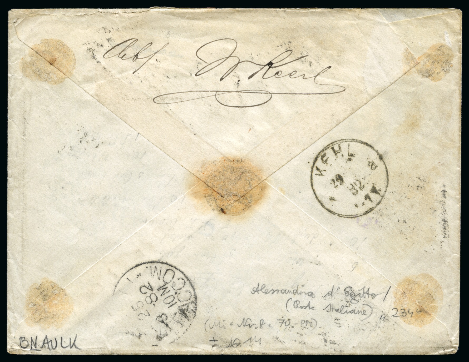 ITALIANE) / ALESSANDRIA D’EGITTO 20 8 82, manuscript “Chargé” and postal marking framed RACCOMANDATO, cancelled at Brindisi 25.8.1882 and Kehl am Rheim 29.8.1882, some light cover wrinkles, an attractive and scarce registered usage; ex Kurt