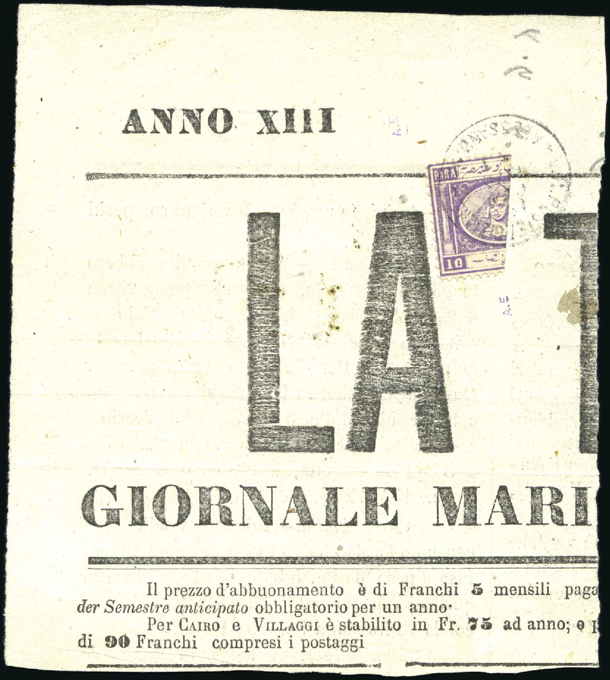 10pa lilac, vertically bisected and tied to a large fragment of the newspaper "LA TROMBETTA" by Alexandria cds, fine and rare (NP D9g, $750) (Image 1)