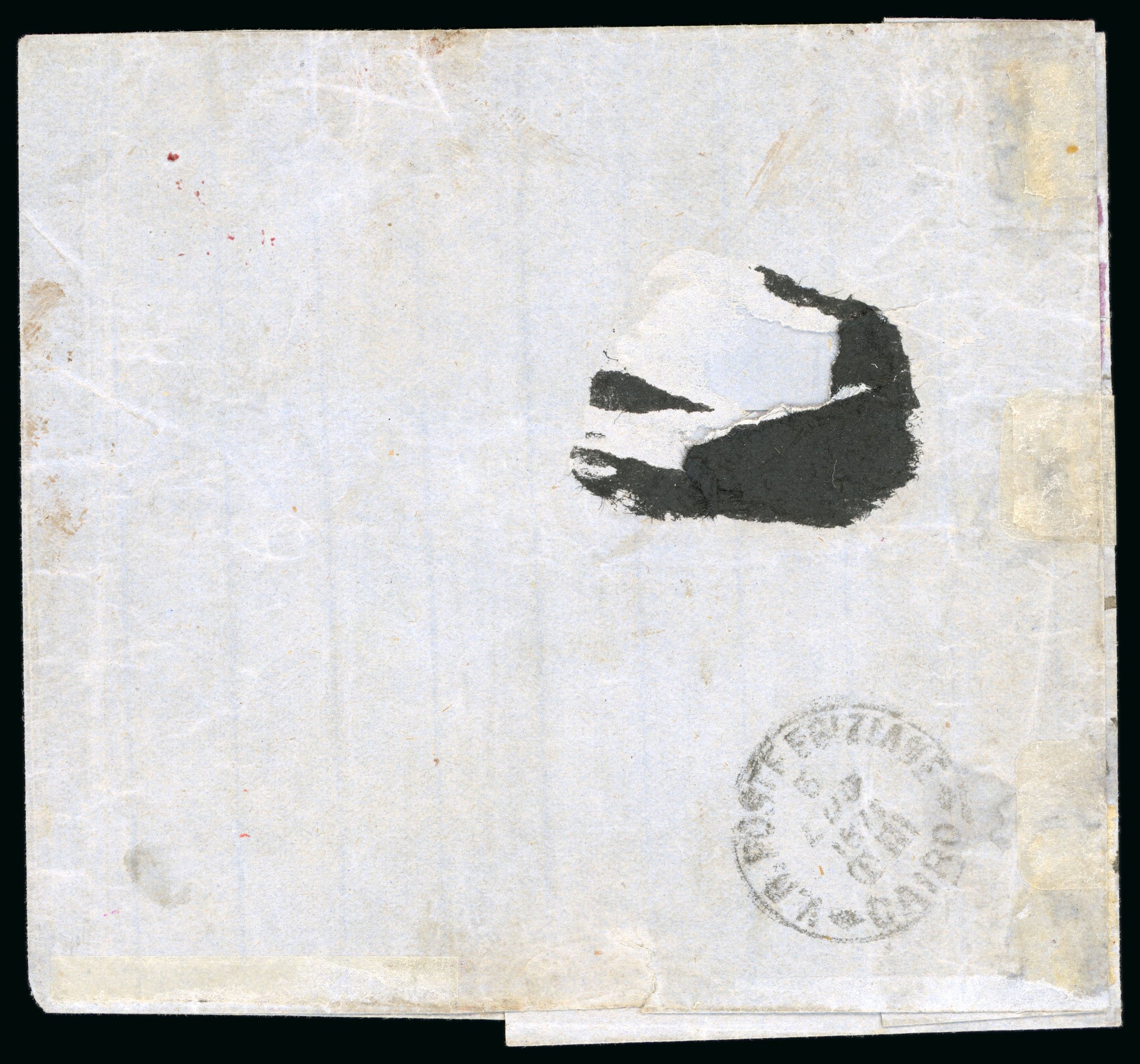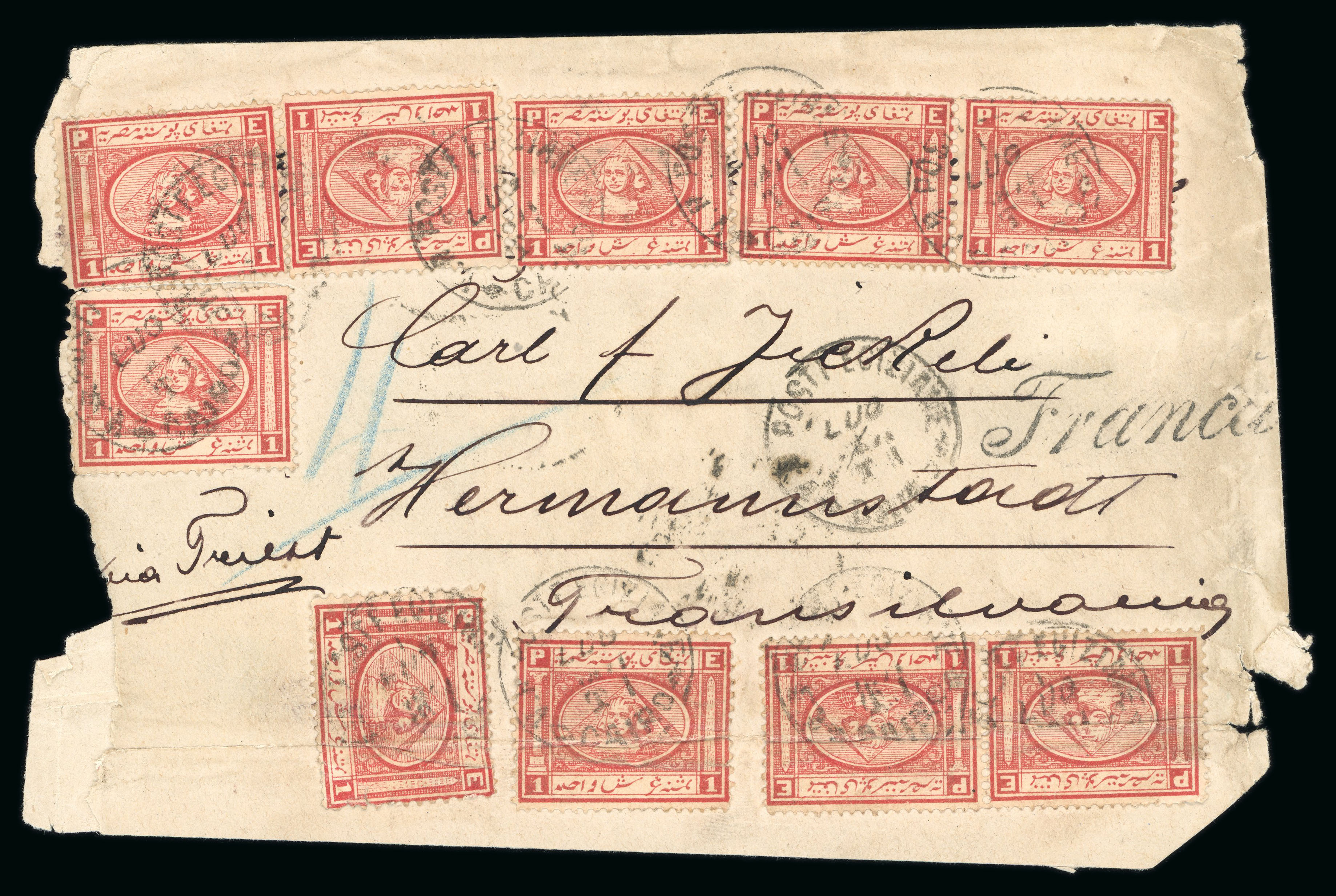 "Franca" in italic to identify the payment according to the 1866 Austro-Egyptian postal convention, with Nagy Szeben arrival bs, cvr faults, a stunning franking to an extraordinary destination, exhibition showpiece. (Image 1)