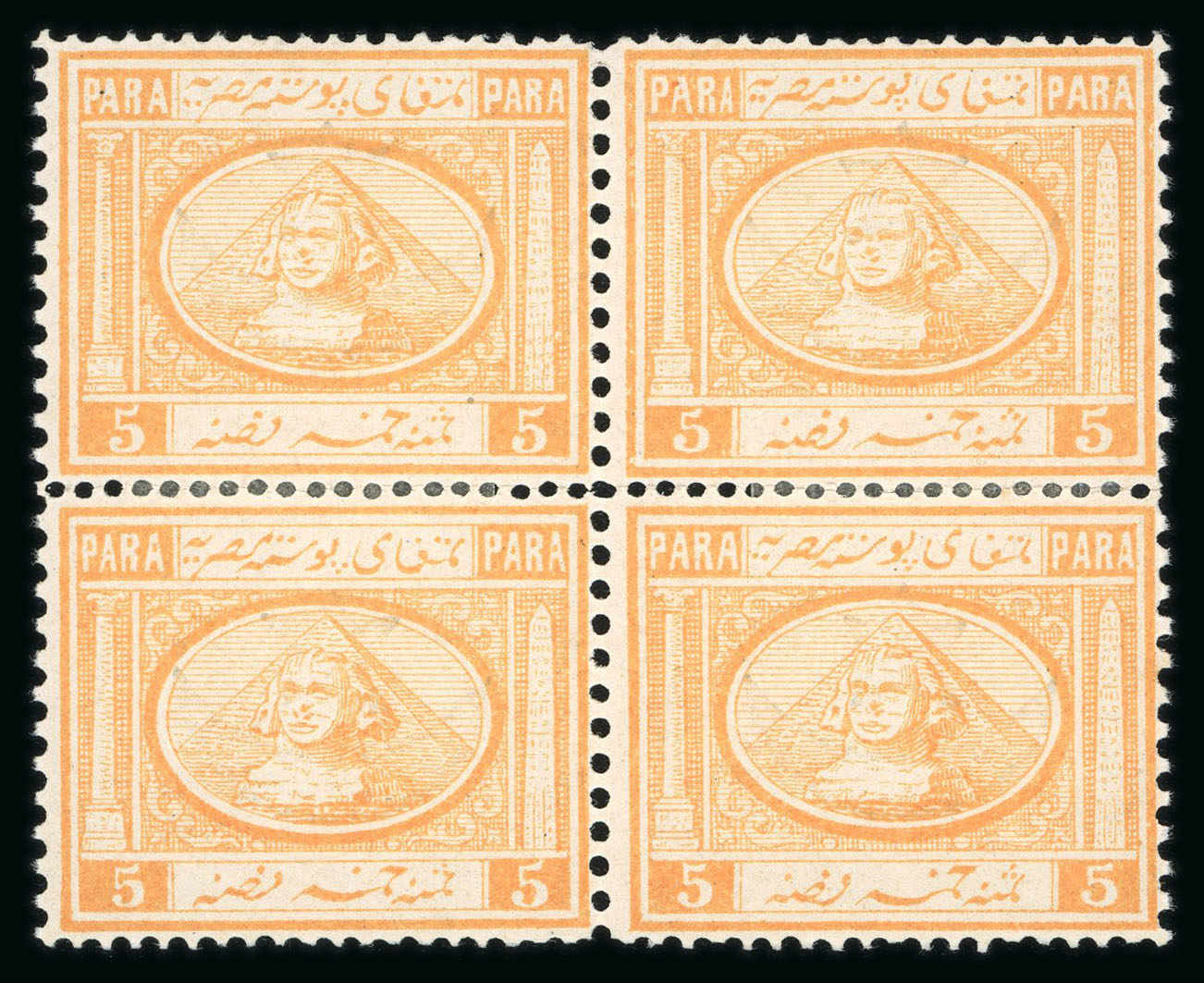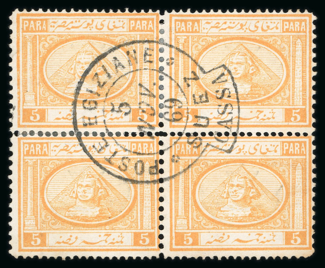 5pa Orange yellow, used rejoined block of four, showing stunning central POSTE EGIZIANE/SUEZ/CASSA "key-hole" cds, fresh, very fine, and a scarce used multiple; ex Lars Alund (NP D8, $175) (Image 1)