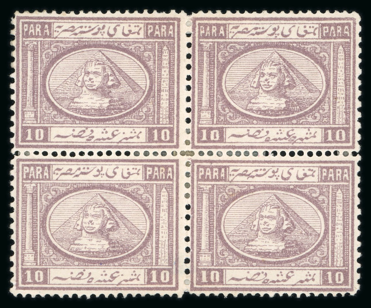10pa Lilac, used block of four, cancelled on fragment by POSTE EGIZIANE/SUEZ cds, very fine and a very scarce used multiple. (Image 1)