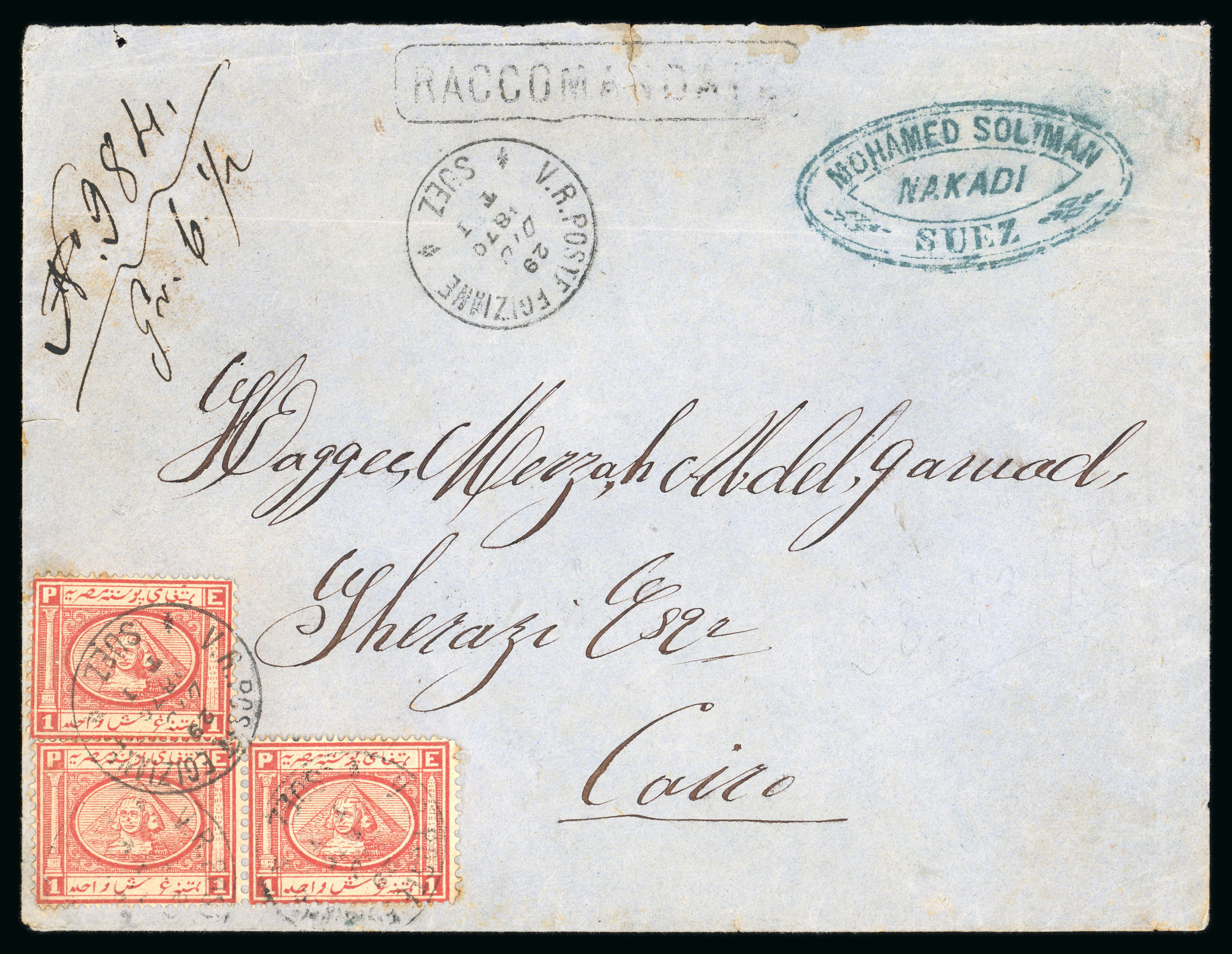 1pi Rose-red, single and a pair, tied on 1867 (29.12) registered envelope from Suez to Cairo, by V.R. POSTE EGIZIANE / SUEZ / 29.DIC.1870 cds, similar alongside and framed RACCOMANDATO, showing manuscript of registration number "984" and