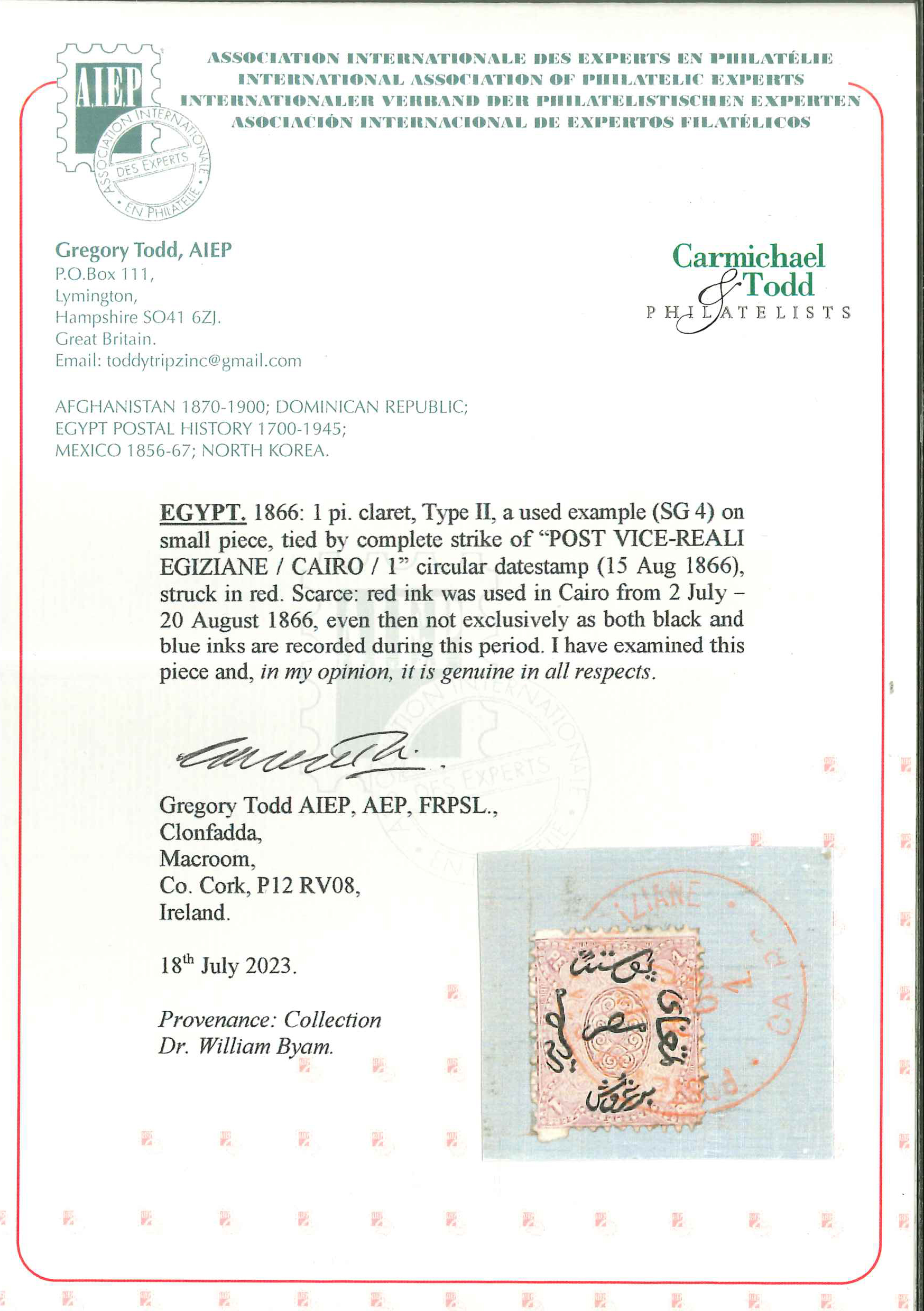 1pi claret, unwmkd, single neatly tied on fragment by POSTE VICE-REALI EGIZIANE/CAIRO/15.AUG.66 cds in RED, very fine and scarce usage of the coloured cancels as only in use from July 2nd to August 20 1866. Cert. Todd (2023). (Image 1)