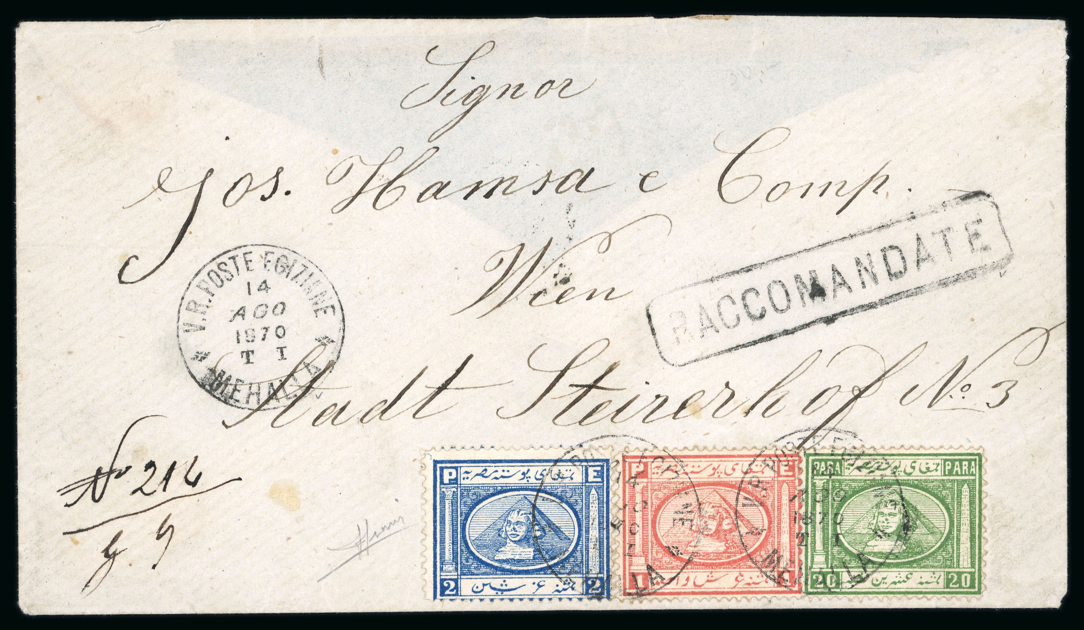1870 (14 Ago) registered envelope to Vienna bearing fine three colour franking 20pa, 1pi and 2pi tied Mehalla cds, framed Raccomandate handstamp above, reverse with Alessandria transit of next day, without arrival maybe due to the lack of