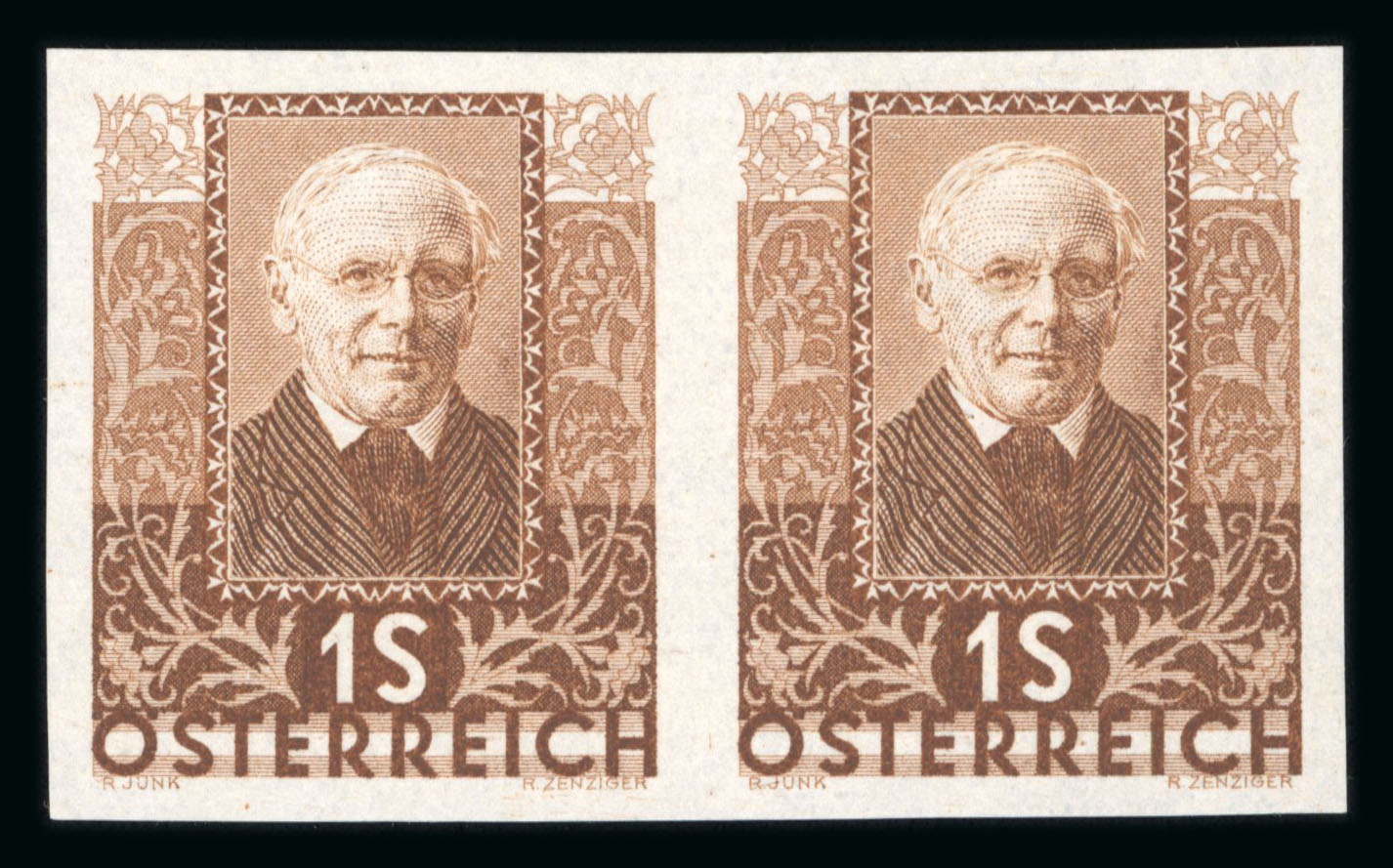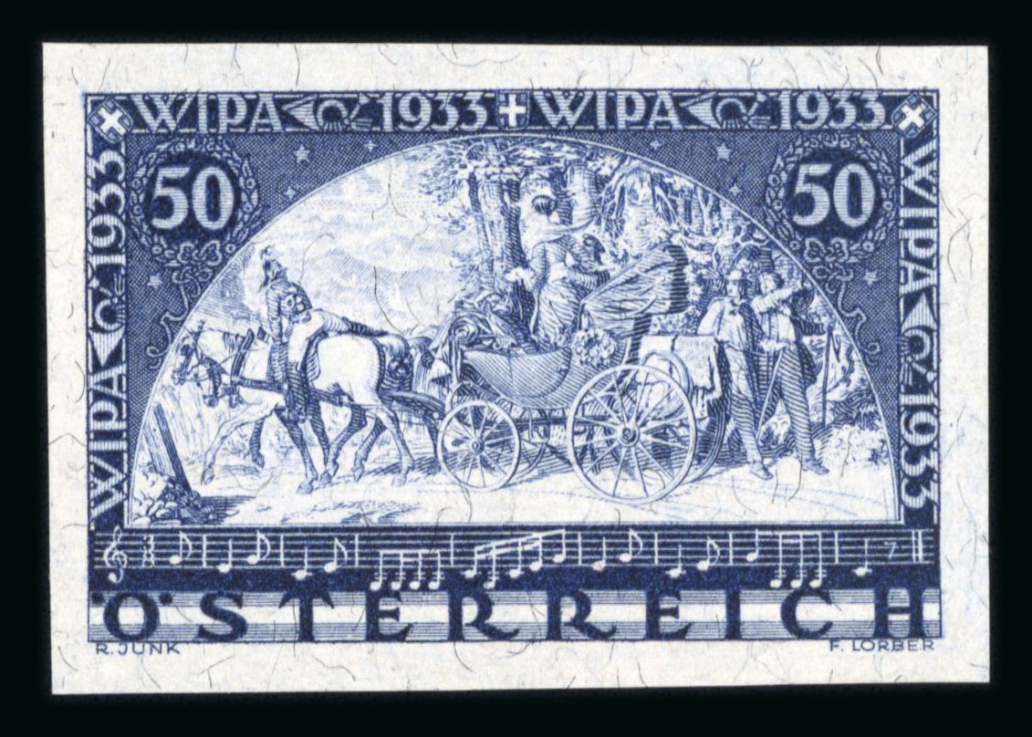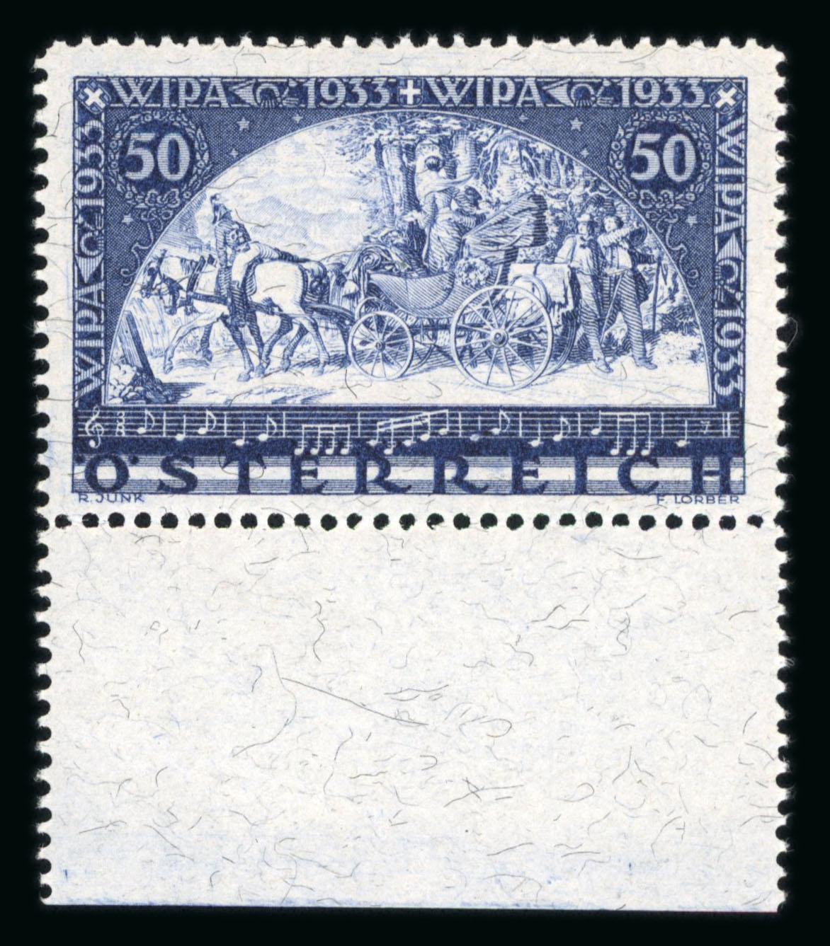 1933, WIPA Faser aus dem einzigen UNGEZÄHNTEN WIPABLOCK, DER ZERSCHNITTEN WURDE. Die ungummierte Marke ist in Prachterhaltung und mit einer 'Auflage' von nur 4 Stück wohl die seltenste ungezähnte Marke der 1. Republik und somit eine