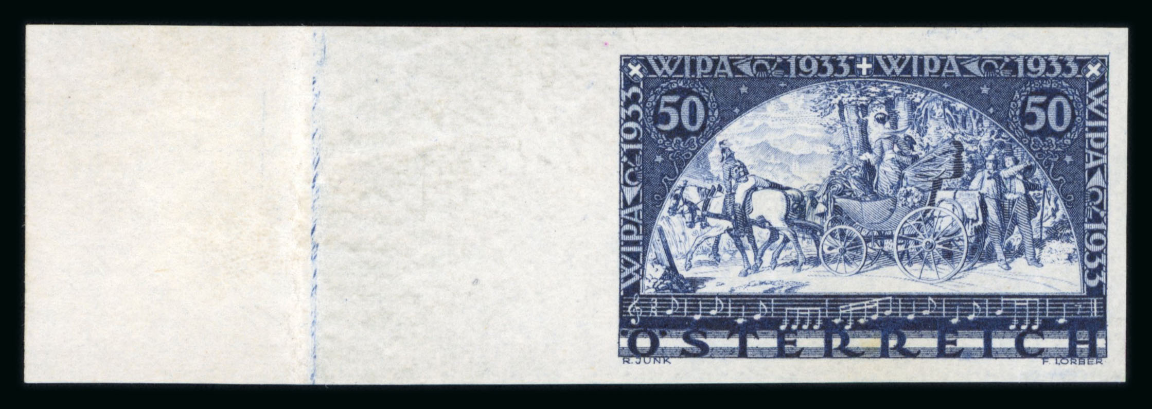 1933, WIPA Marke auf gewöhnlichem Papier (sog. WIPA glatt) UNGEZÄHNT vom linken Bogenrrand (Jumbo margin), ungummiert, in sehr dunkler violettblauer Nuance, sehr seltene Marke in Prachterhaltung, signiert Dr.Wallner, Attest Soecknick, ANK