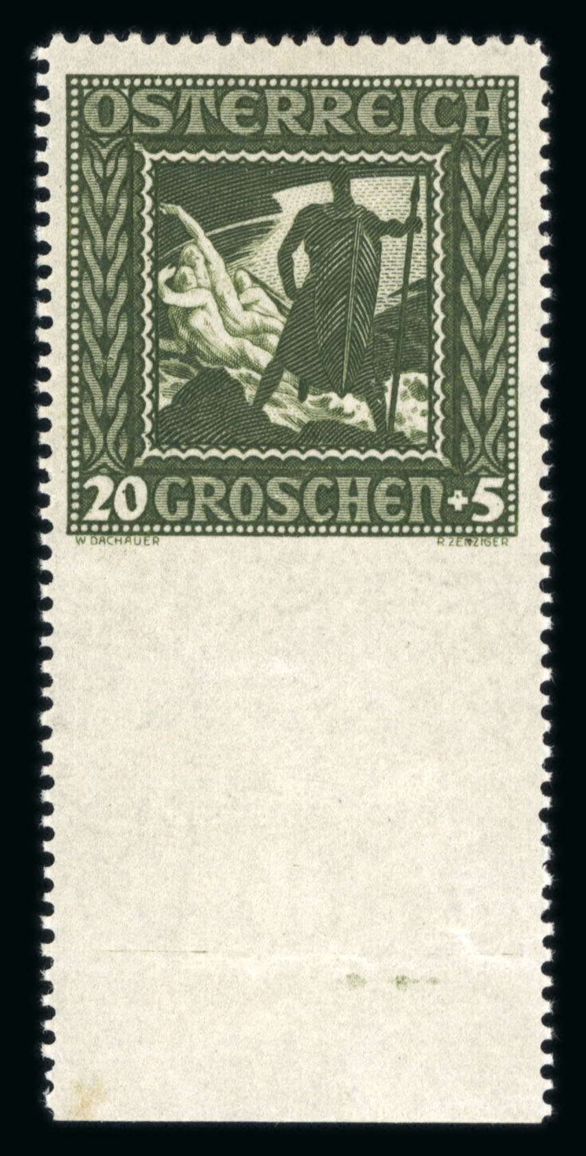 1926, Nibelungen 20g olivgrün mit Abart: unten UNGEZÄHNT mit breitem Bogenrand, postfrisches Prachtstück dieser seltenen Marke, Attest Soecknick, ANK und Mi unbekannt (sollte Mi und ANK 491Uu werden). (Image 1)