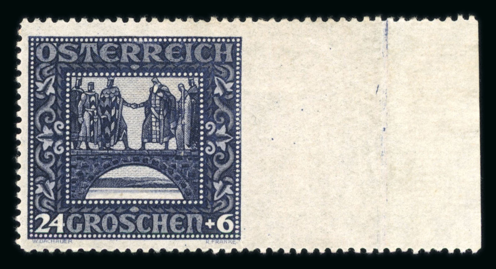 1926, Nibelungen 24g dunkelviolett mit Abart: rechts UNGEZÄHNT mit breitem Bogenrand, postfrisches Prachtstück dieser seltenen Marke, signiert und Attest Puschmann, Attest Soecknick, ANK und Mi 492Ur, ANK €1200. (Image 1)