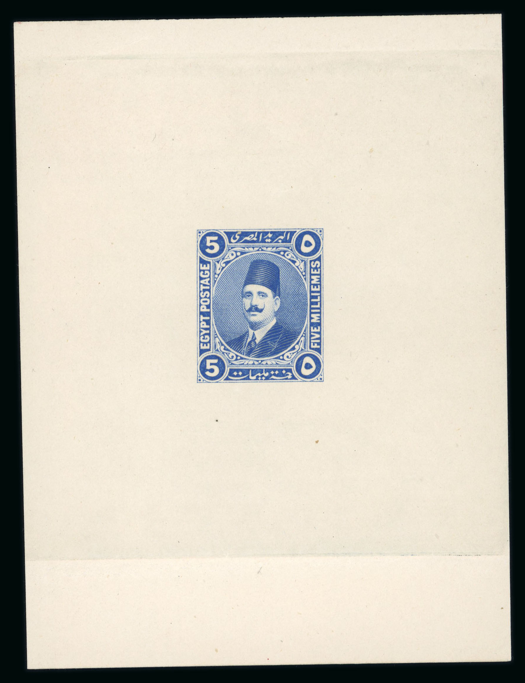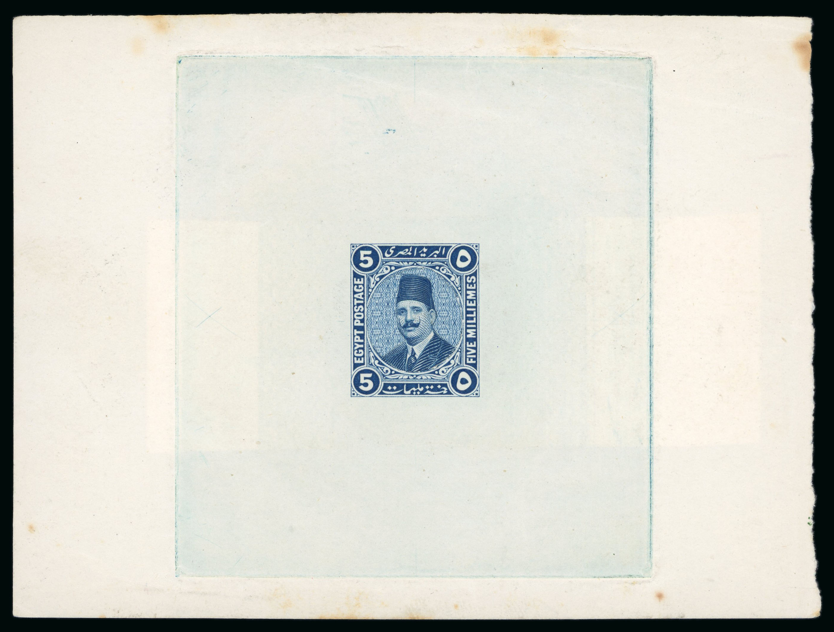 1922 Essays of Harrison & Sons: 5m light blue, large die proof sheetlet, proposed colour for the 5m value, 76 x 94mm, very fine and scarce (NP E223, $325) (Image 1)