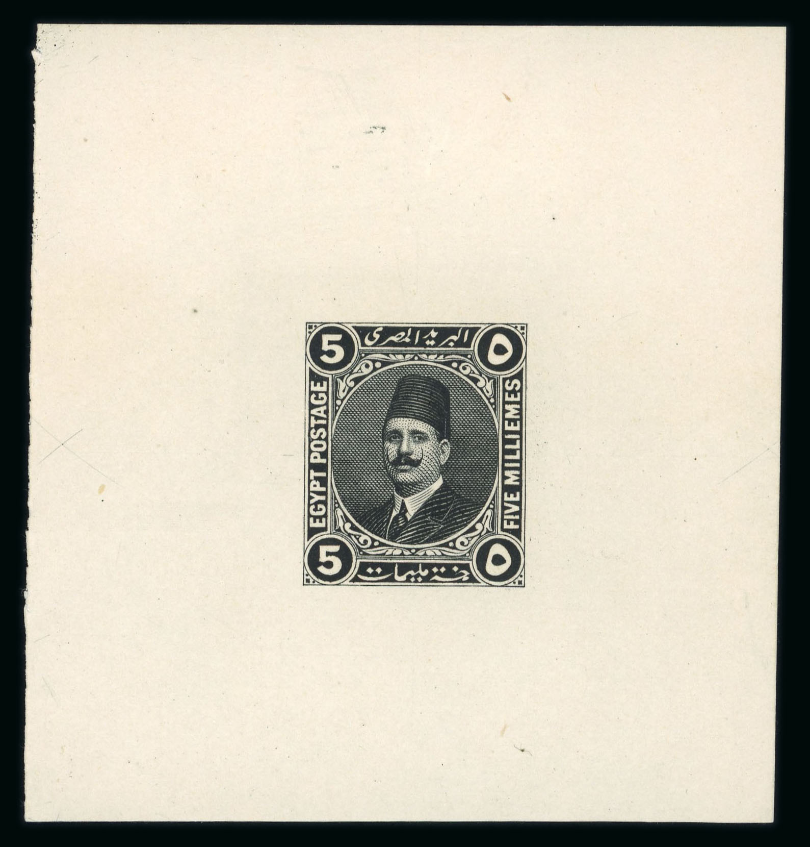1922 Essays of Harrison & Sons: 5m black, large die proof sheetlet, proposed colour for the 5m value, 76 x 94mm, very fine and scarce (NP E223, $325) (Image 1)