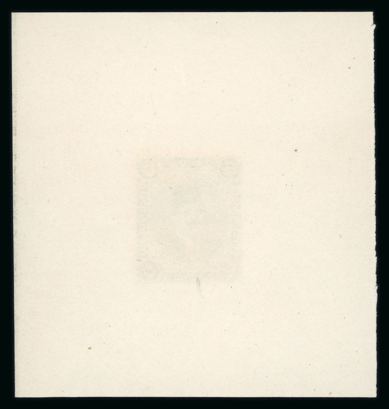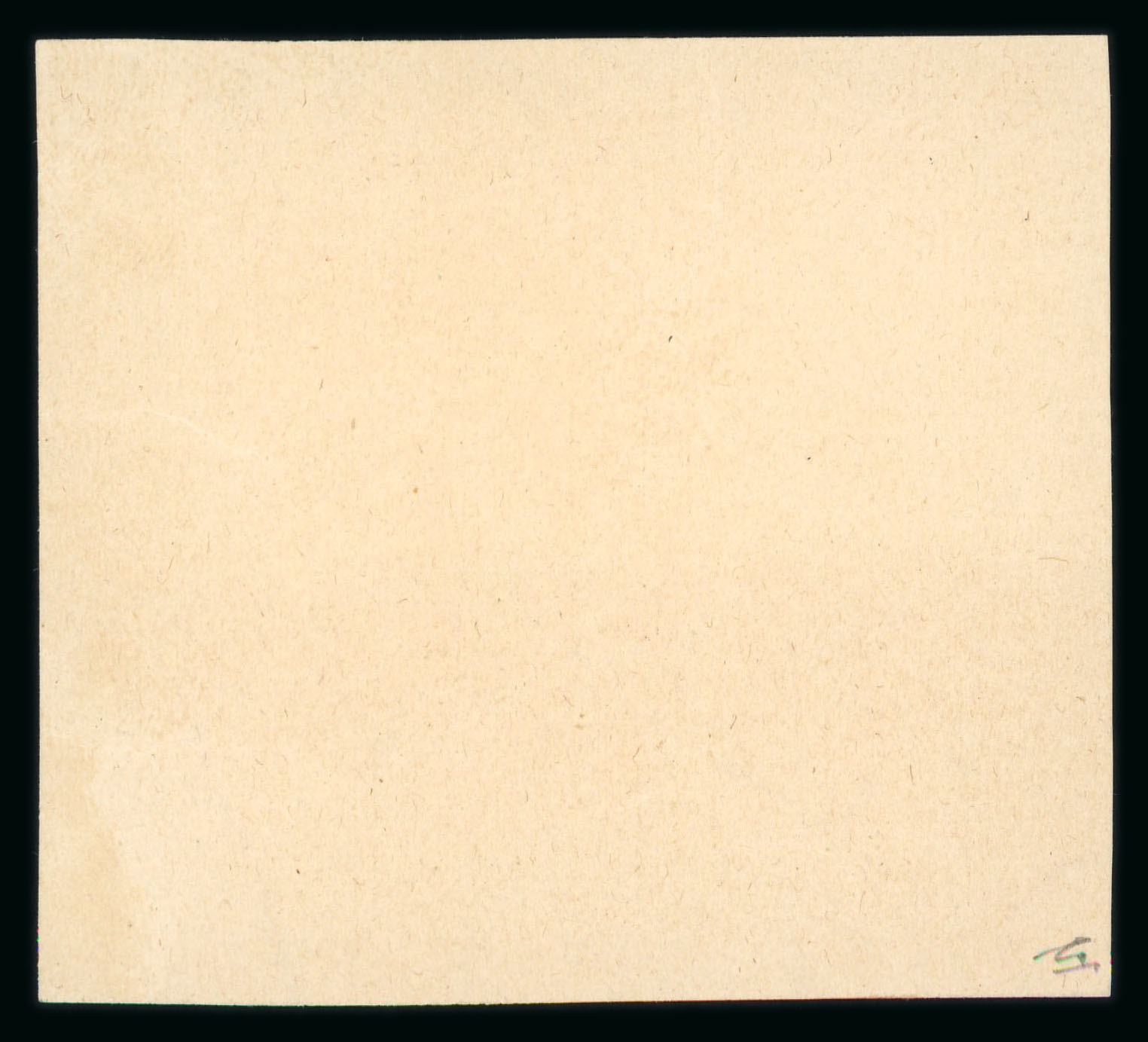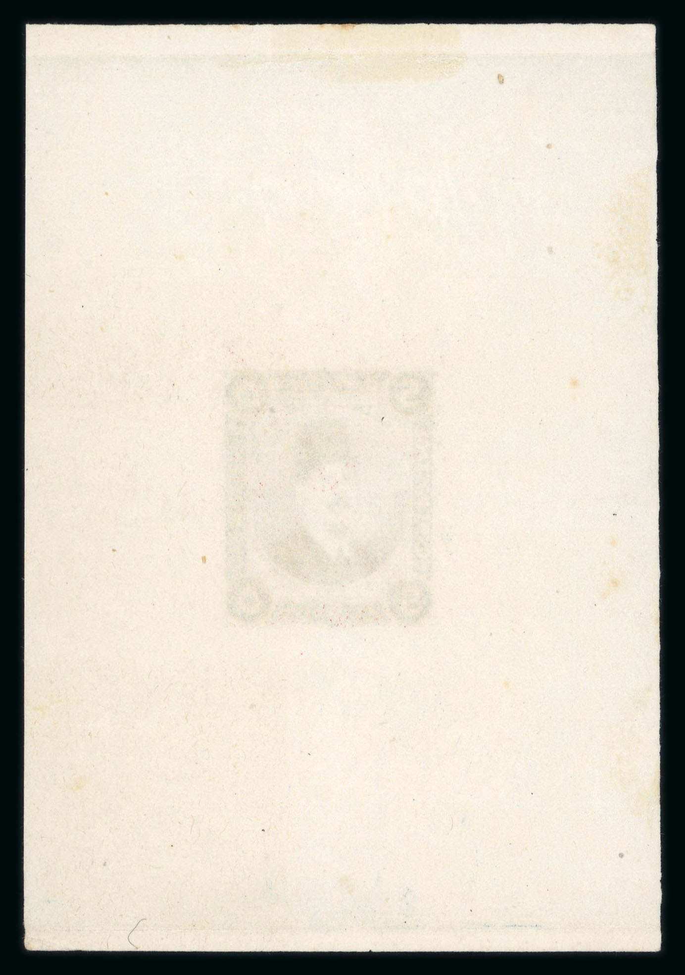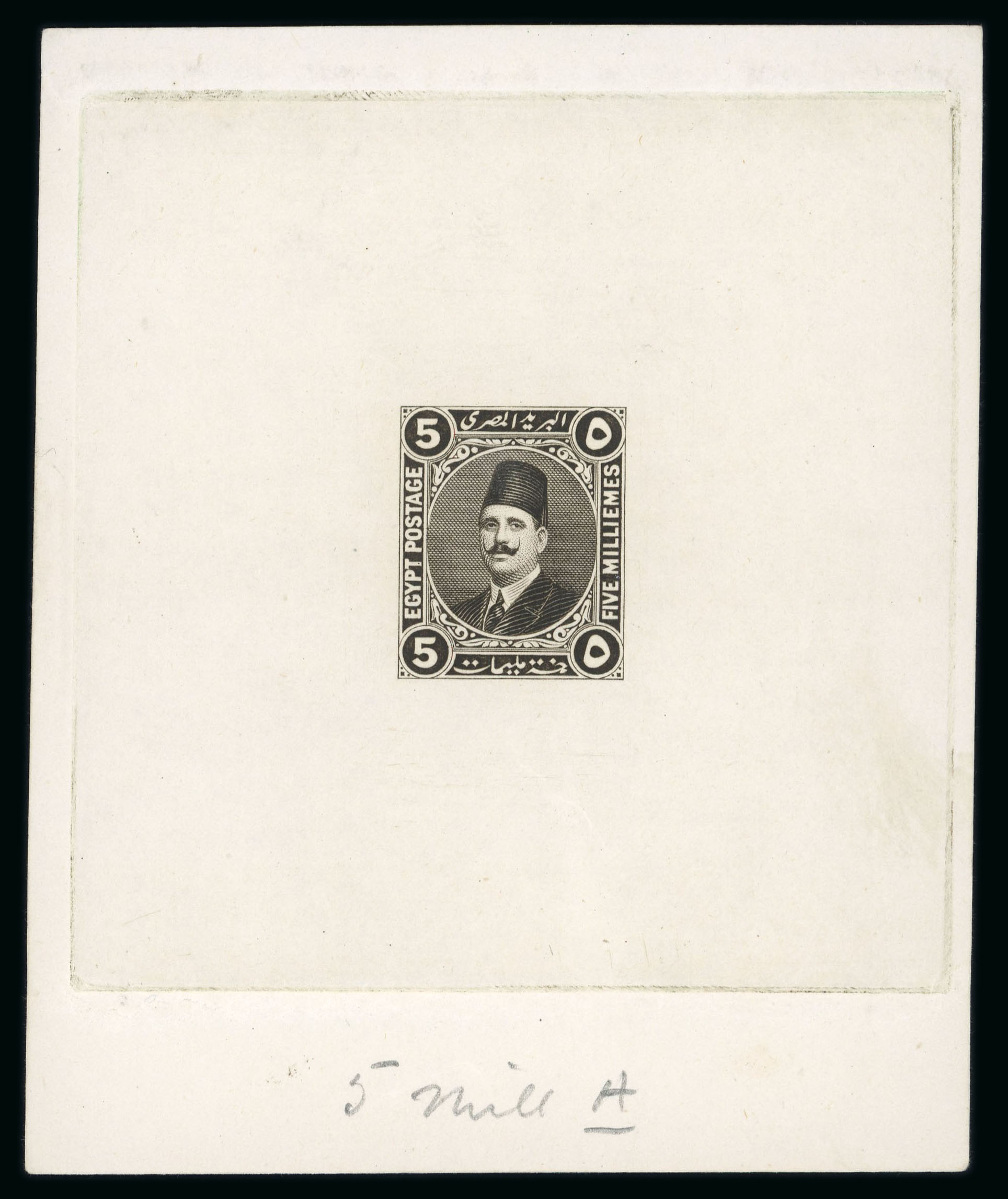 1922 Essays of Harrison & Sons: 5m black, large die proof sheetlet, proposed colour for the 5m value, 76 x 94mm, annotated in bottom margin "% mill A", very fine and scarce (NP E223, $325) (Image 1)