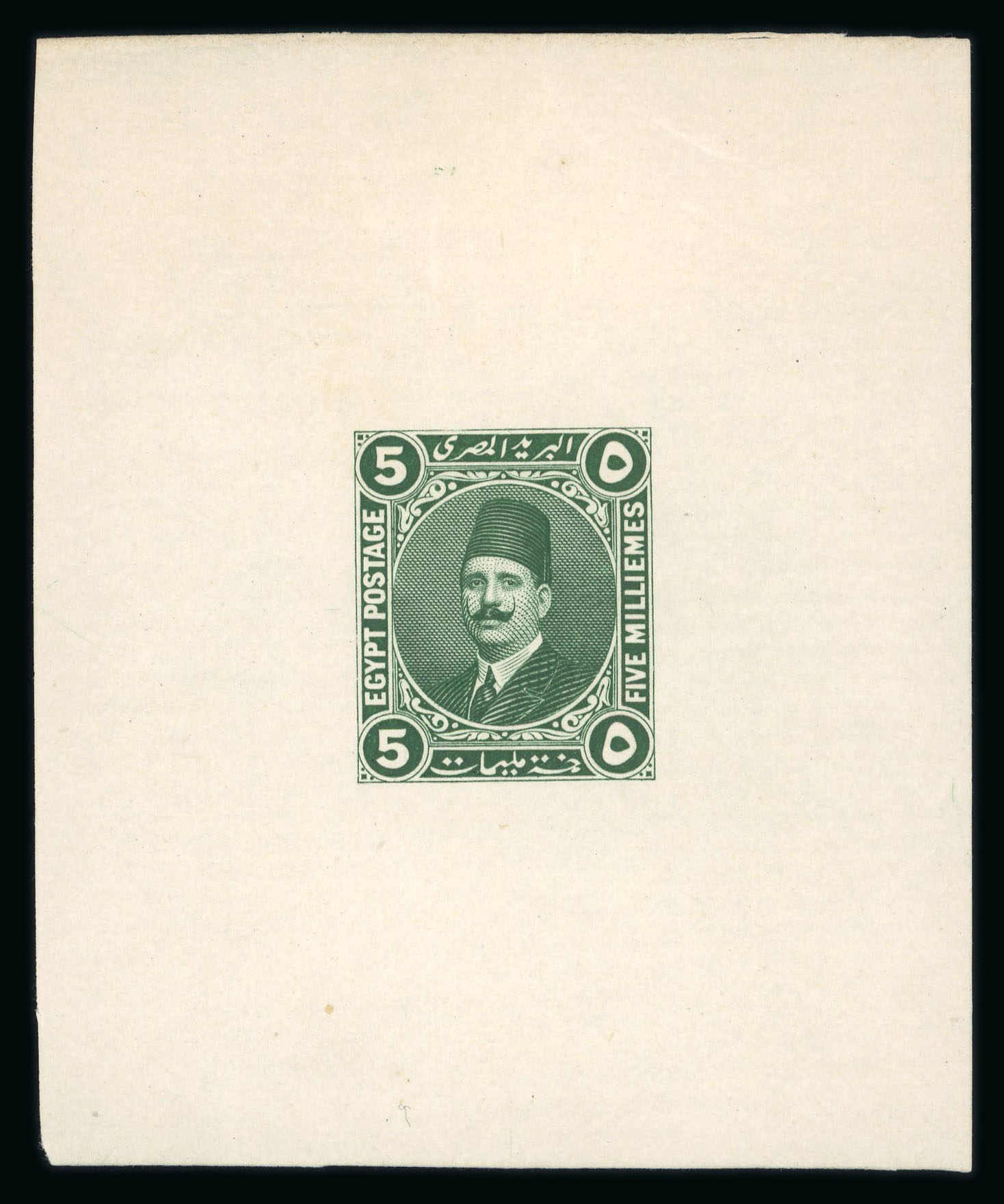 1922 Essays of Harrison & Sons: 5m green, large die proof sheetlet, proposed colour for the 5m value, 76 x 94mm, very fine and scarce (NP E223, $325). (Image 1)
