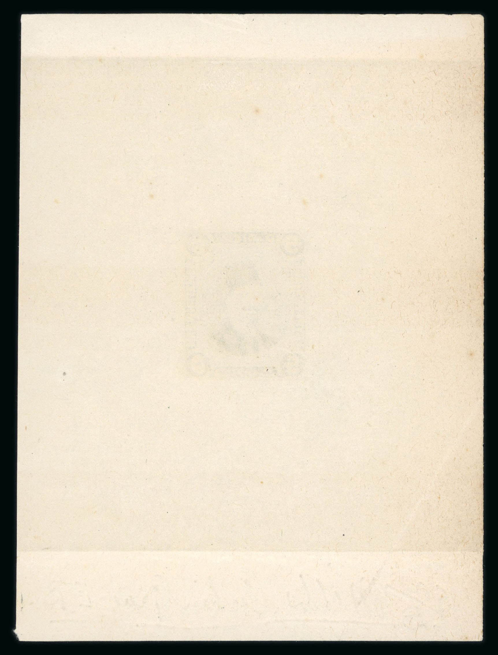 1922 Essays of Harrison & Sons: 5m grey, large die proof sheetlet, proposed colour for the 5m value, 76 x 94mm, annotated in bottom margin "50 mill B Cochin grey E.B.", very fine and scarce (NP E223, $325) (Image 1)