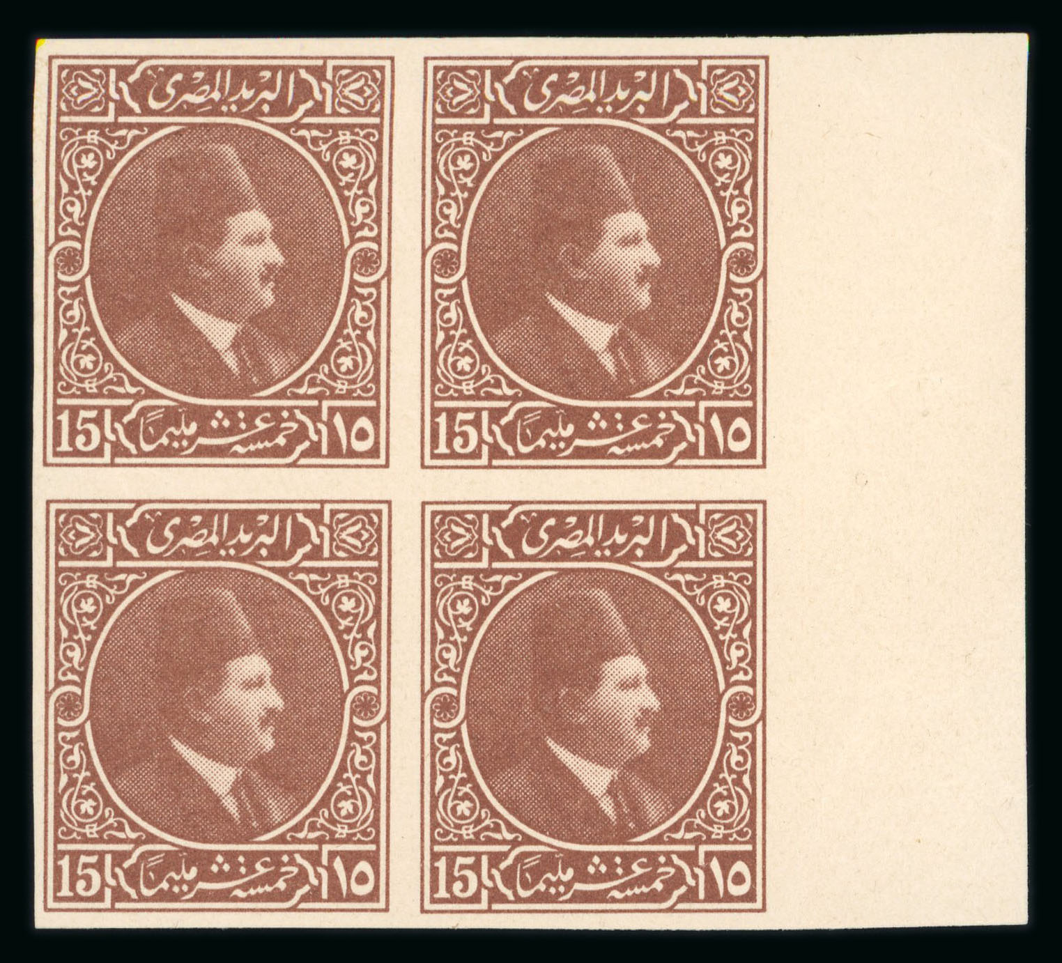 1922 Essays of Harrison & Sons: 15m brown, small format with floral garlands, right marginal block of four, on ungummed and unwatermarked paper, very fine and scarce (NP E204a, $500) (Image 1)