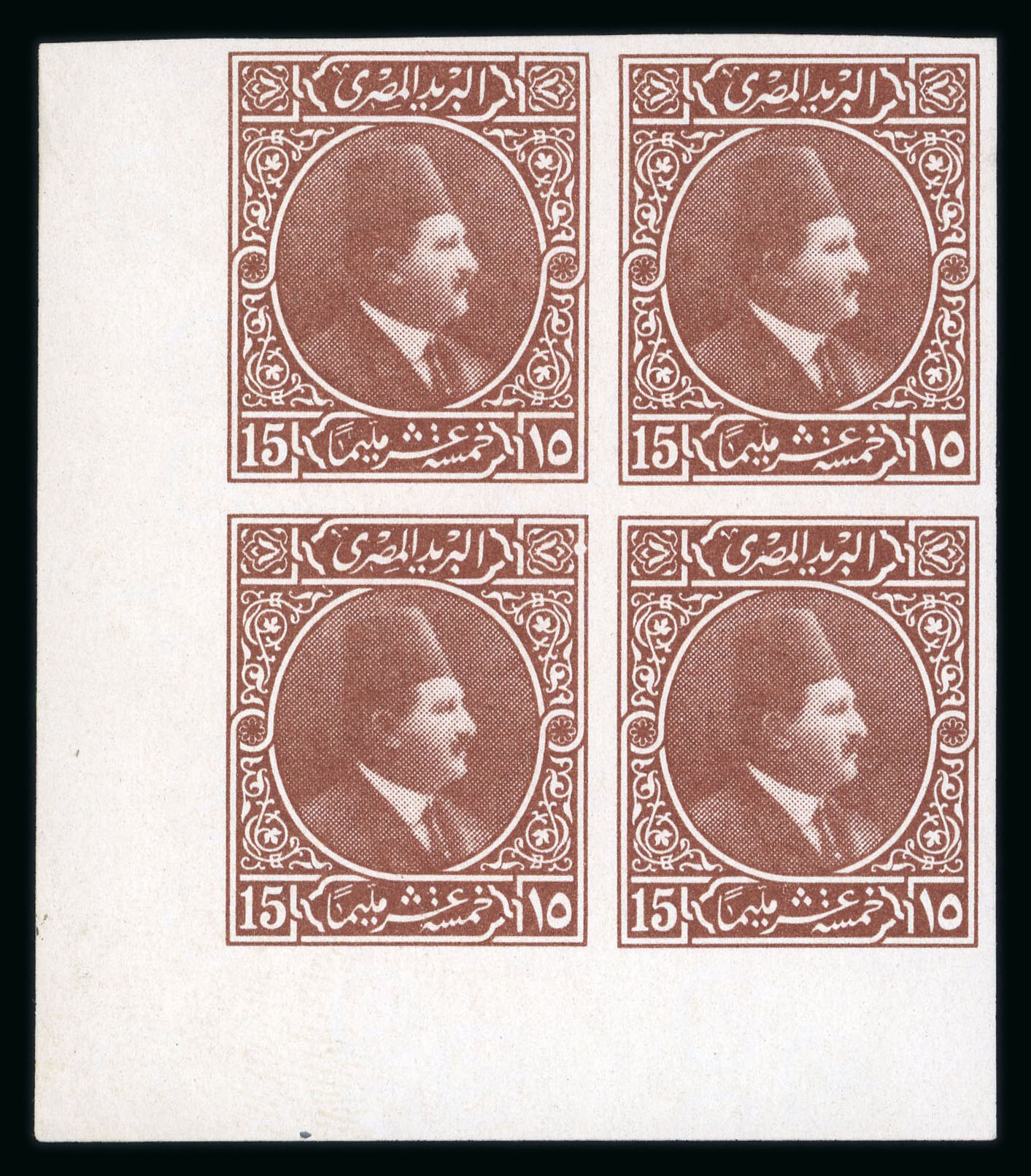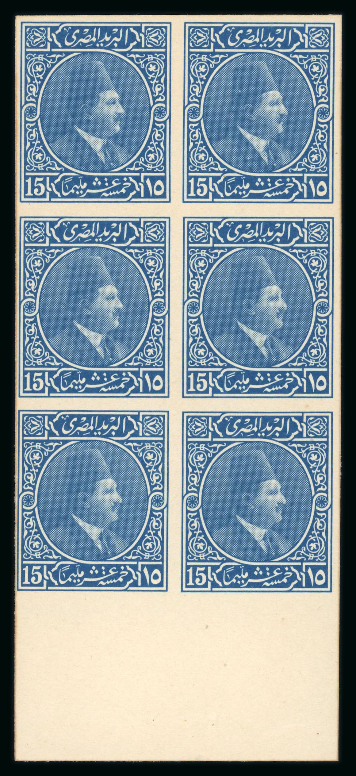 1922 Essays by the Survey Department of Egypt, Cairo: 15m Blue, small format, vignette depicting Fouad facing right, two different designs with lotus on the left and papyrus on the right, on ungummed thick paper in se-tenant sheetlet,