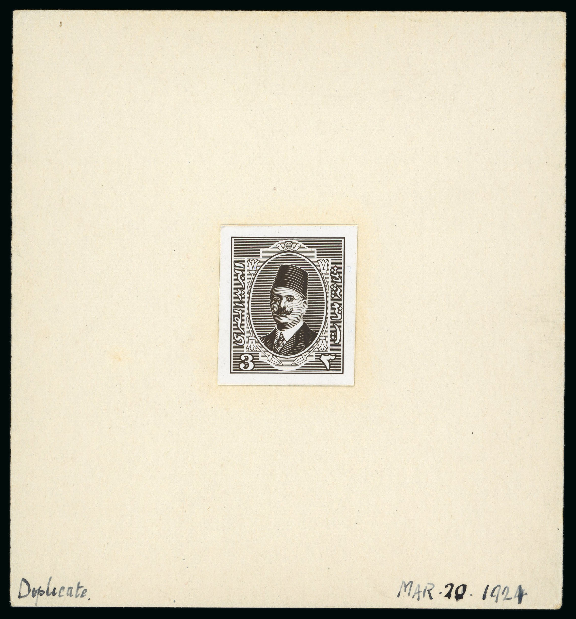 1924-27 Essays by the Survey Department: Photographic line-illustration for the 3m mounted on sunken card, in sepia, design similar to King Fouad First Portrait issue, annotated "Duplicate" in the bottom left and dated "March 20, 1924",