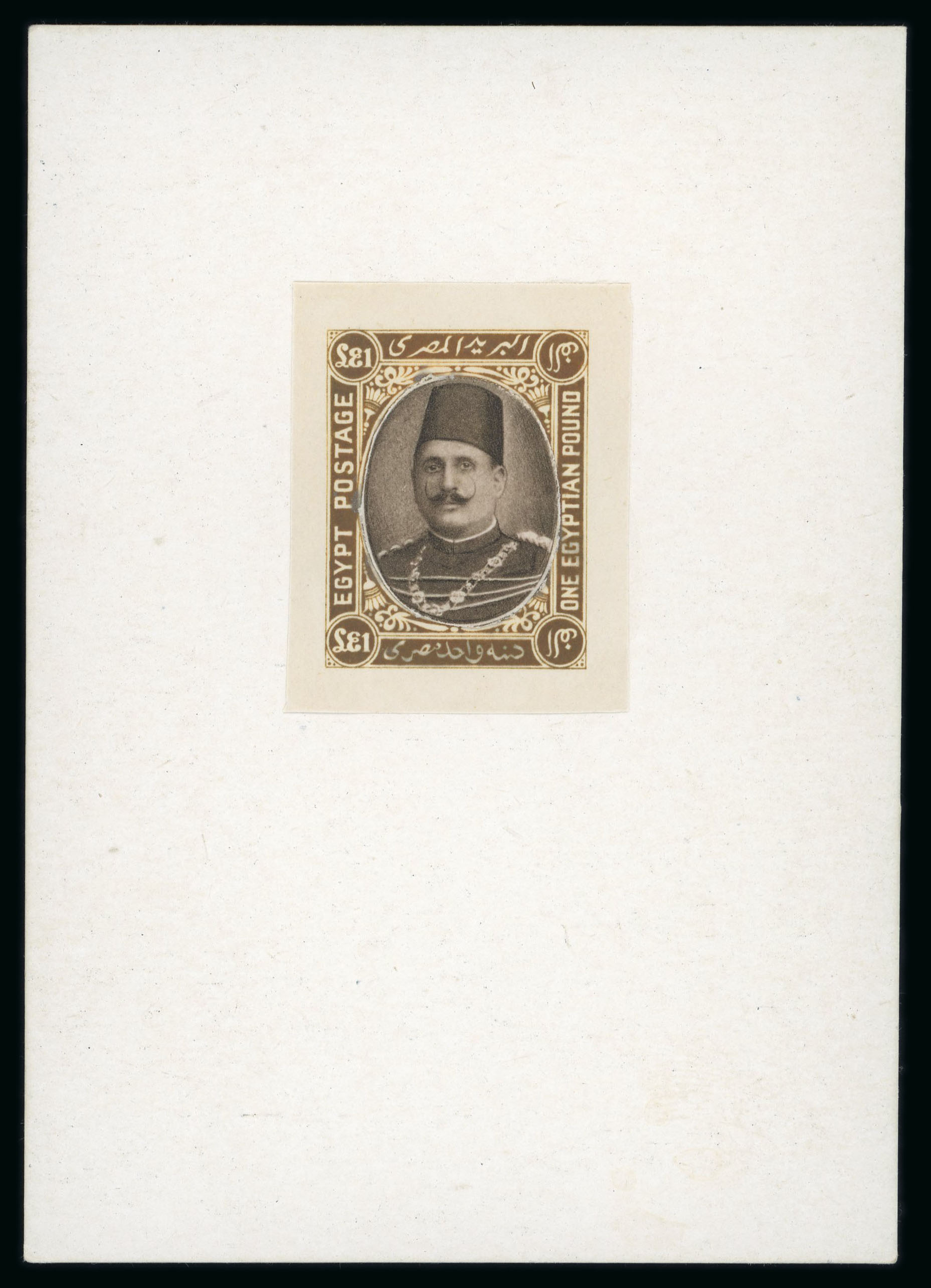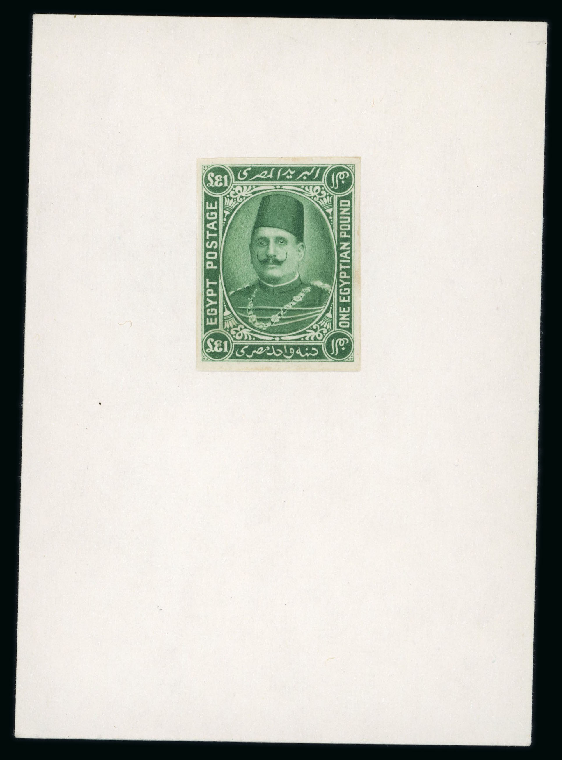 1926 Unadopted essay by De La Rue: Engraved die proof for the 1m value in dark green, showing King Fouad in Military uniform, very fine and extremely rare (NP E307, $2'250). (Image 1)