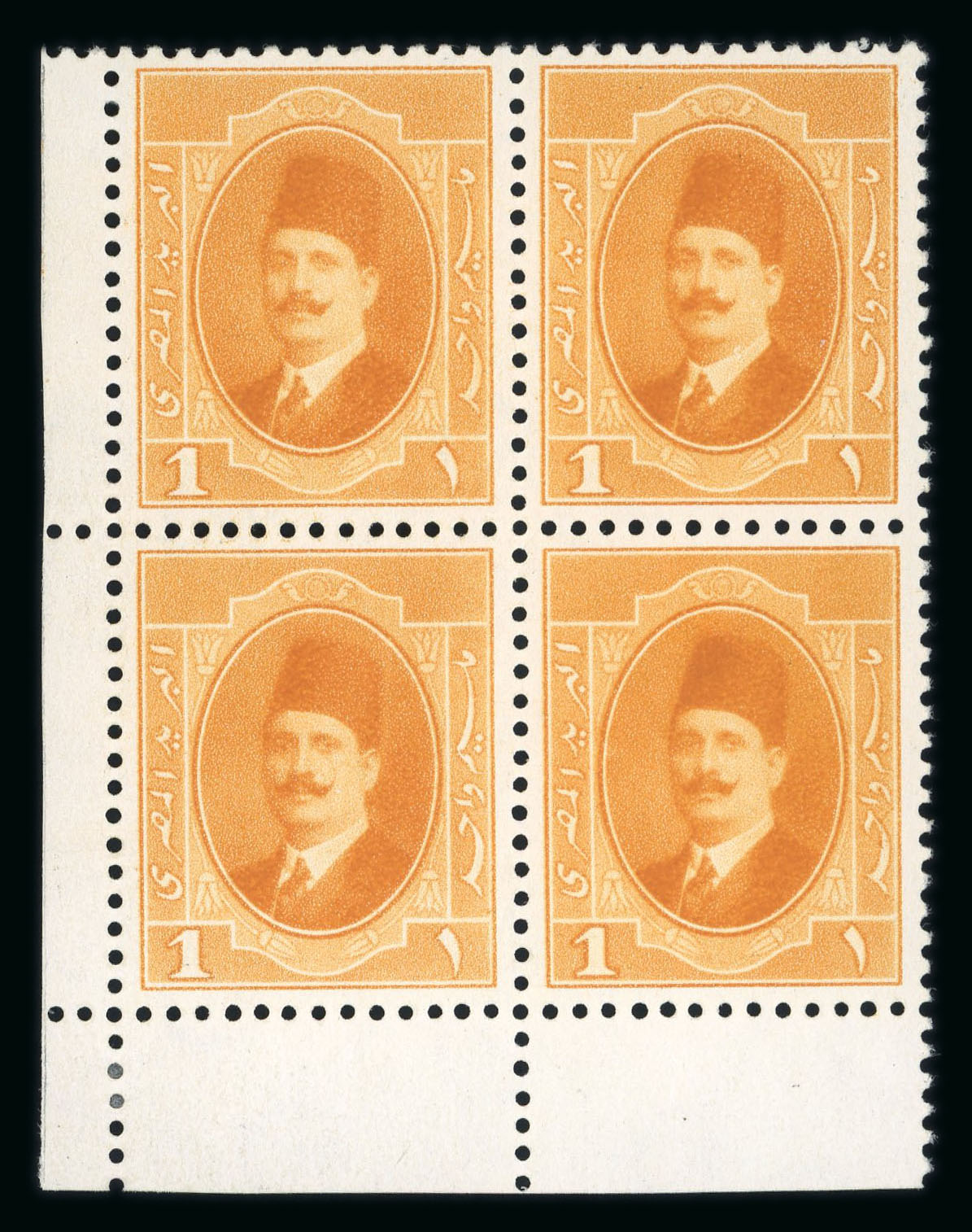 1923-24 King Fouad 1st Portrait Issue: 1m to 10m, mint and mint nh, group of eleven marginal or bottom left corner sheet marginal plate blocks of four or six, fine and scarce (48).