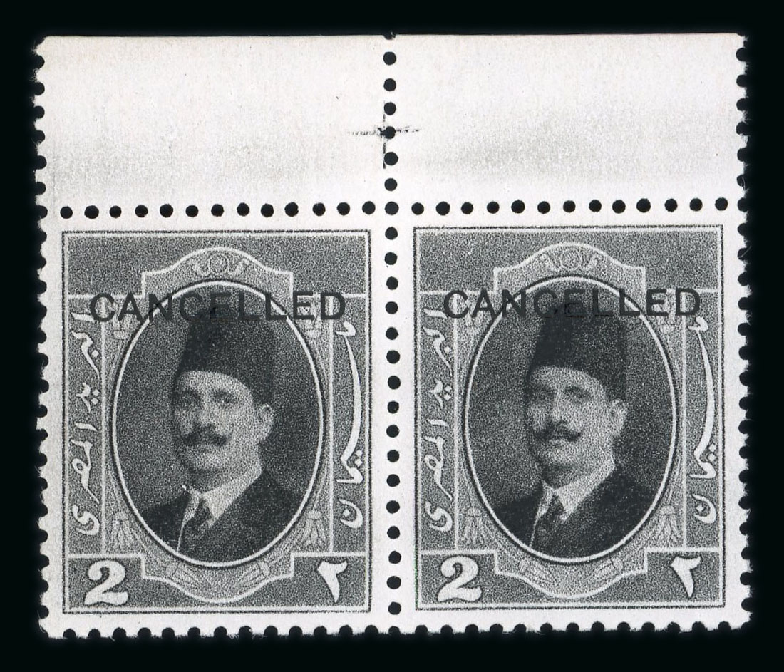 1923-24 First Portrait Issue: 2m pale black with type A "CANCELLED" overprint in mint n.h. top marginal pair, very fine and scarce (NP $350+) (Image