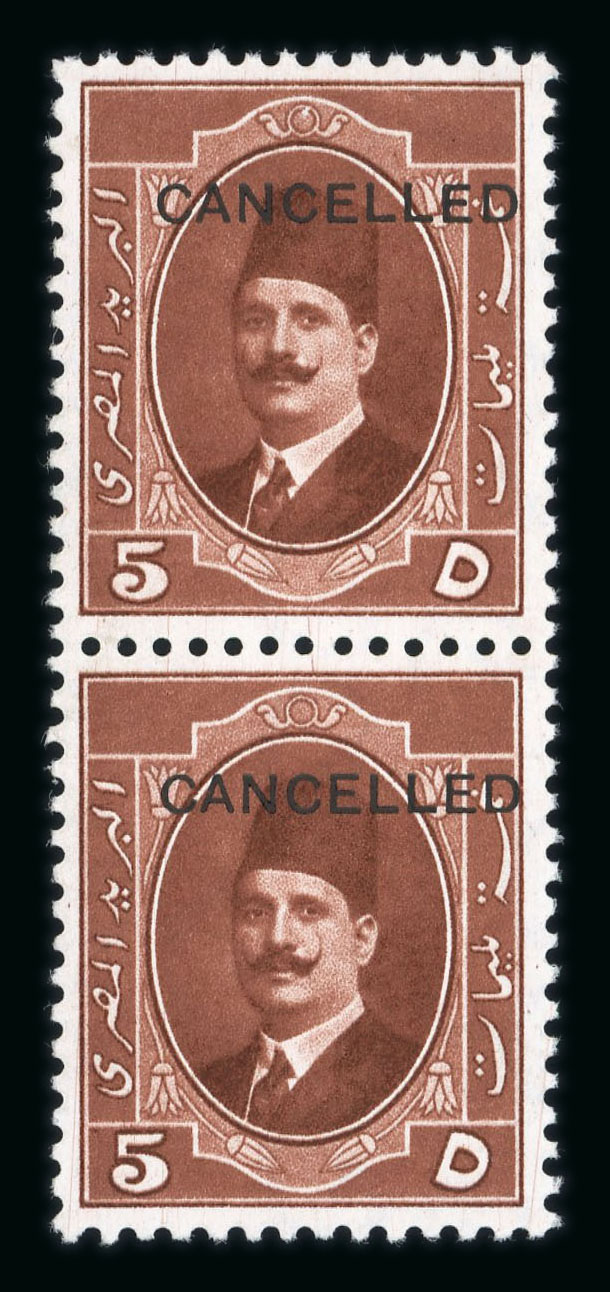 1923-24 First Portrait Issue: 5m chestnut with type A "CANCELLED" overprint in mint n.h. vertical pair, very fine and scarce (NP $350+) (Image 1)