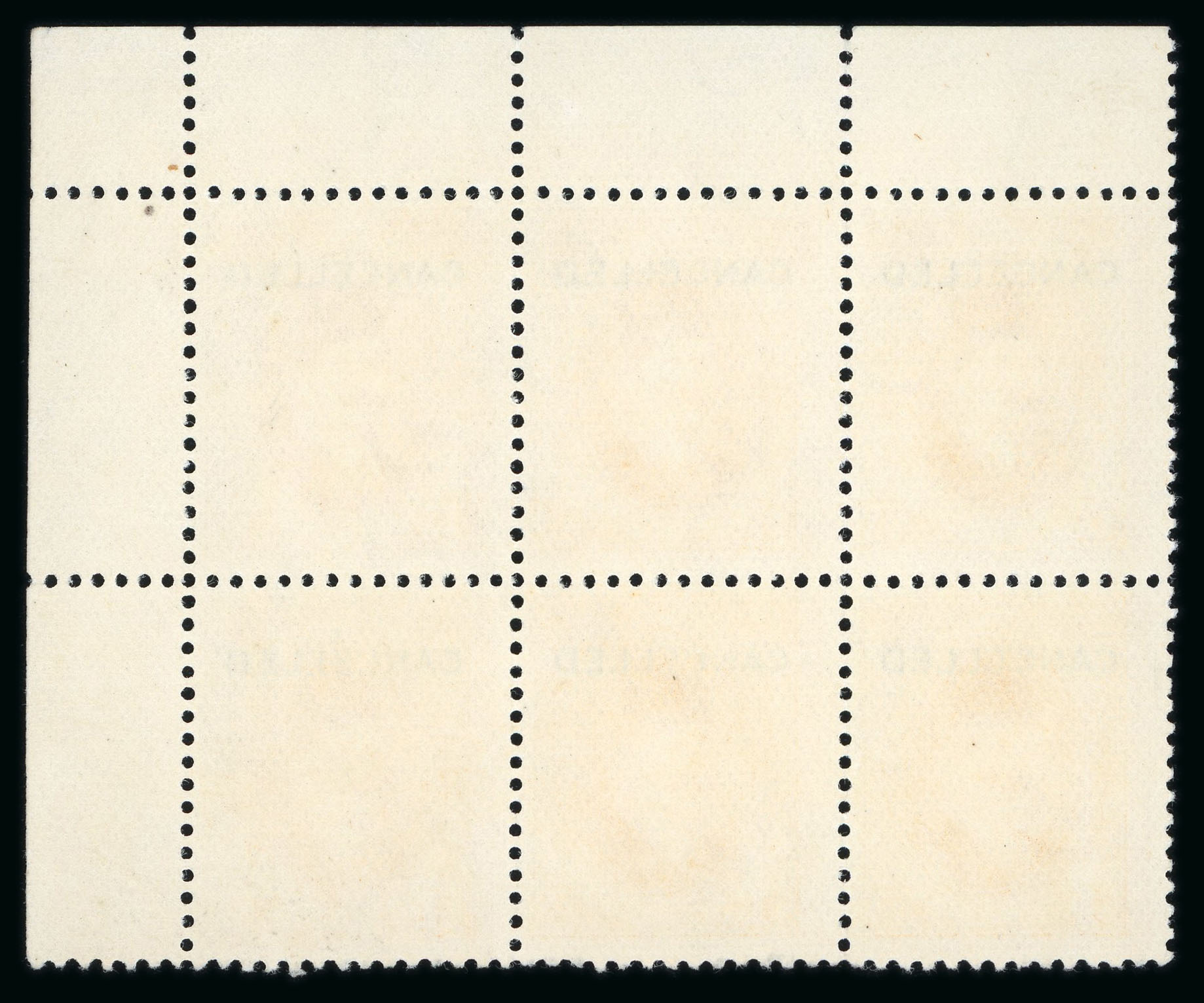 1923-34 King Fouad 1st Portrait Issue: 1m Orange, issued colour, unused top right corner sheet marginal block of six on wmkd paper, showing overprint "CANCELLED" Type A in black, very fine and scarce. (Image 1)