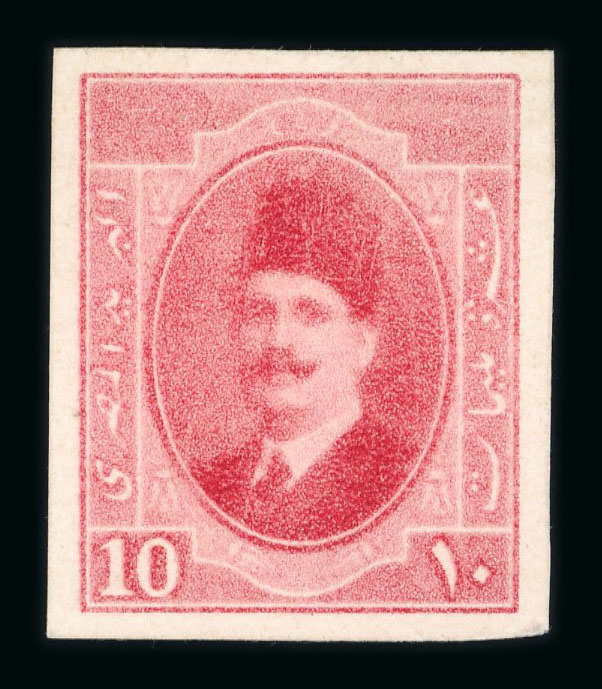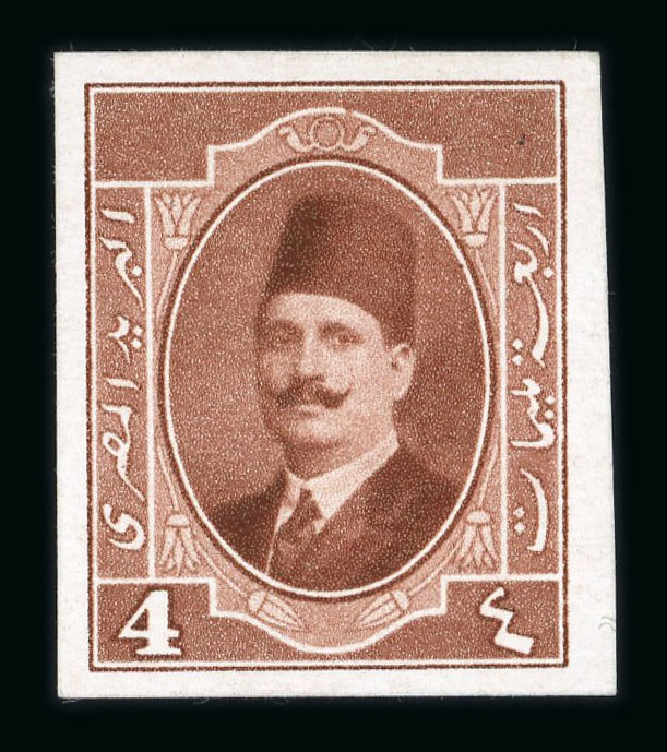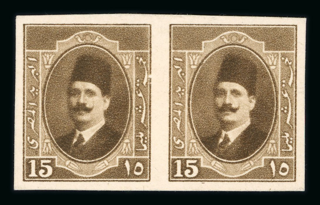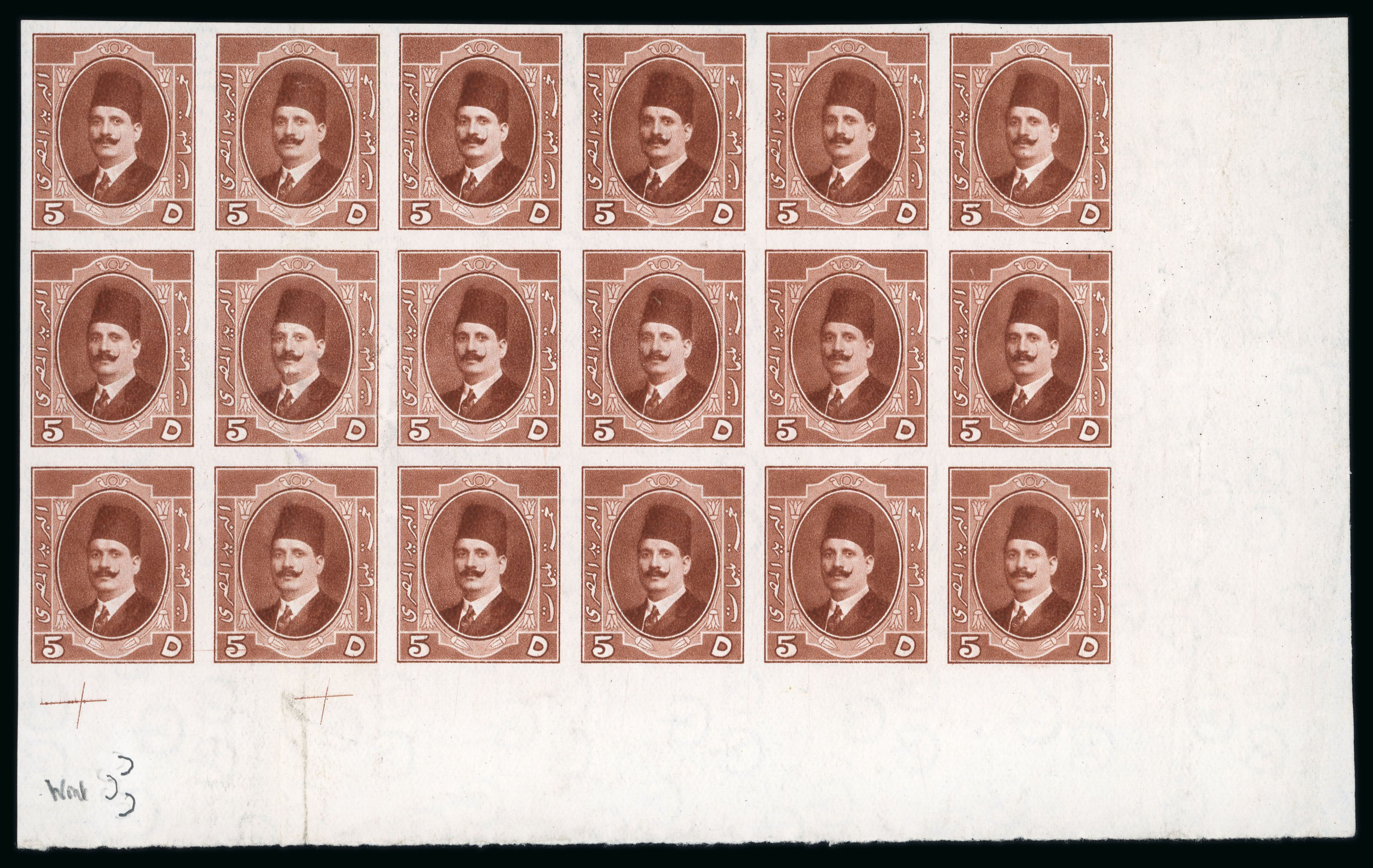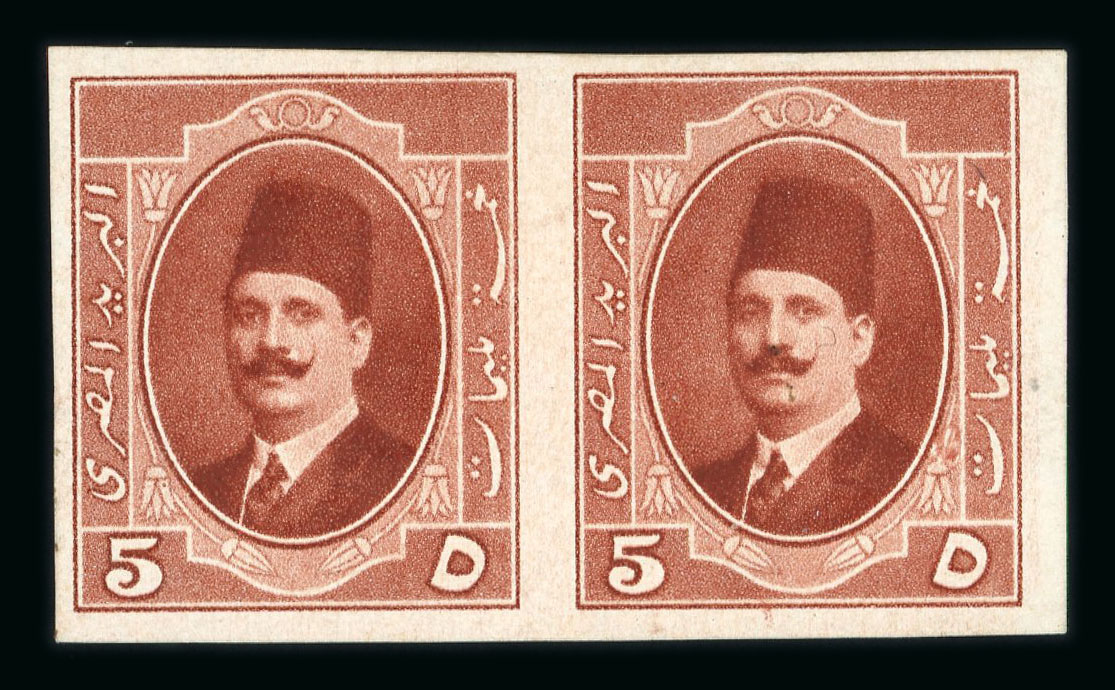 1923-24 King Fouad 1st Portrait 5m red-brown, two imperforate proof blocks of four, one on ungummed paper and the other on gummed paper, very fine. (Image 1)