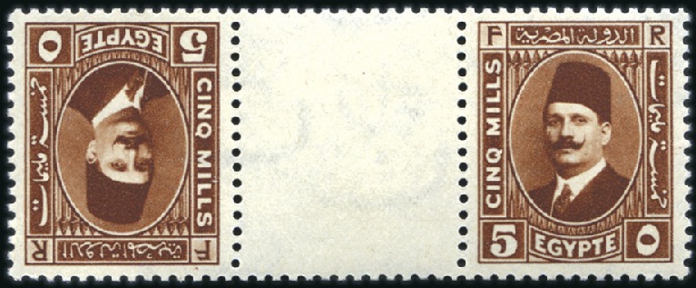 1927-37 King Fouad 2nd Portrait Issue: 5m dark red-brown, tete-beche gutter pair, showing Royal cancelled on reverse, very fine and scarce (NP D112k, $400), (Image 1)