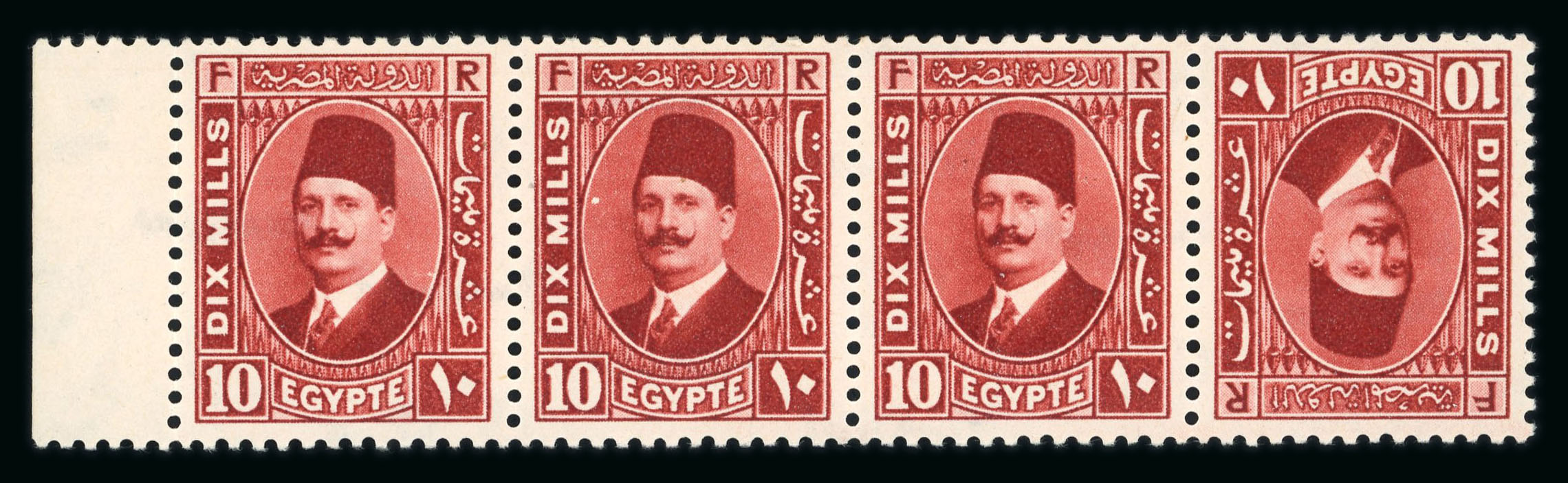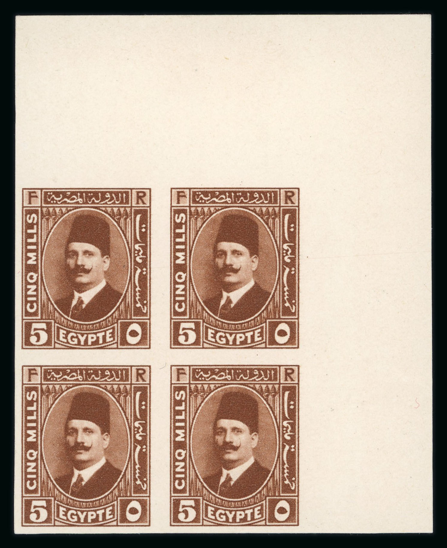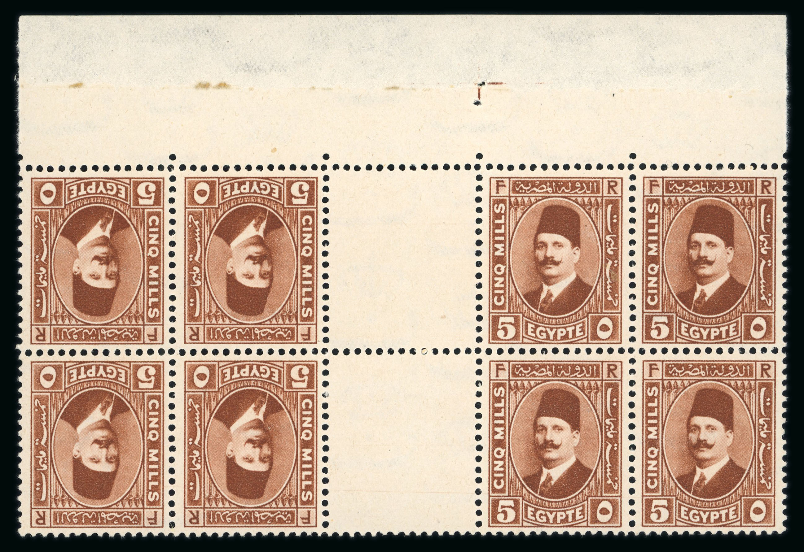 1927-37 King Fouad 2nd Portrait 5m dark red-brown, type II, mint nh bottom left corner sheet marginal control number A/30 block of ten with two tête-bêche pairs, showing Royal misperfs., very fine and a very scarce block. (Image 1)